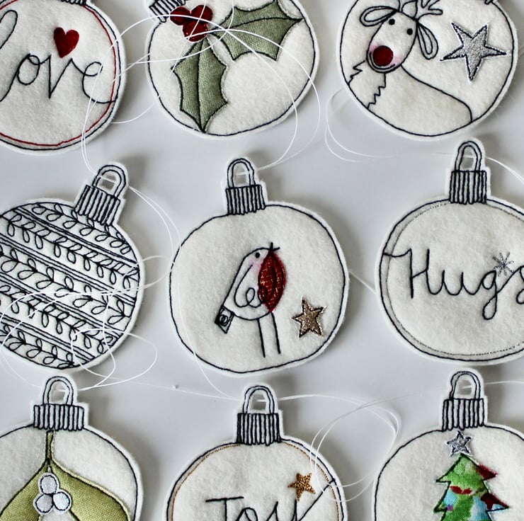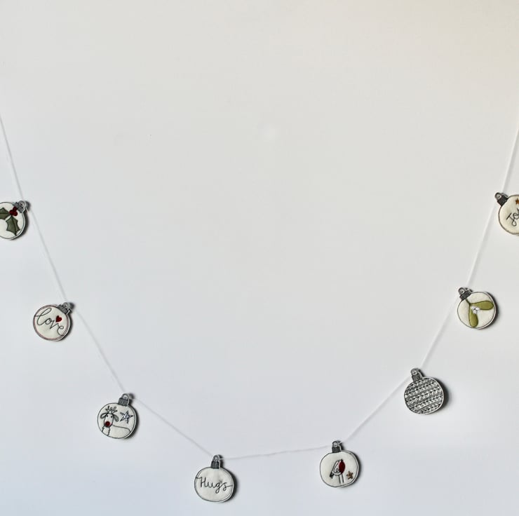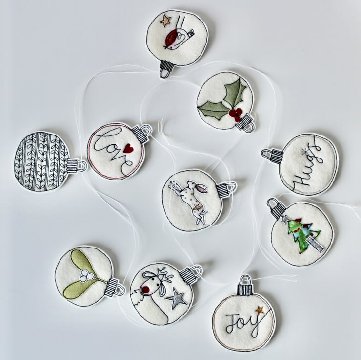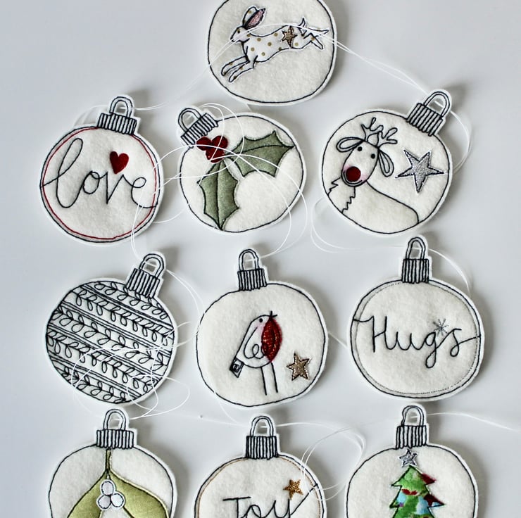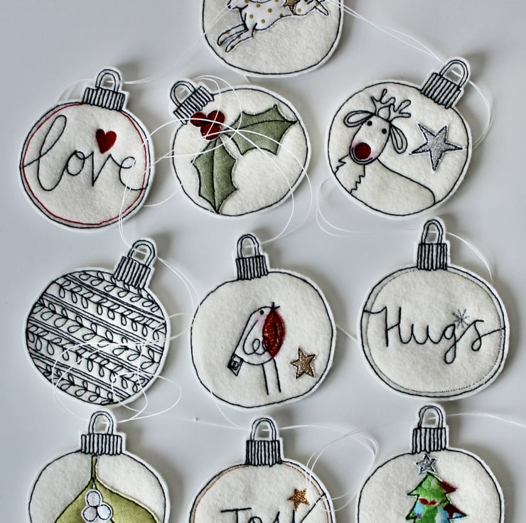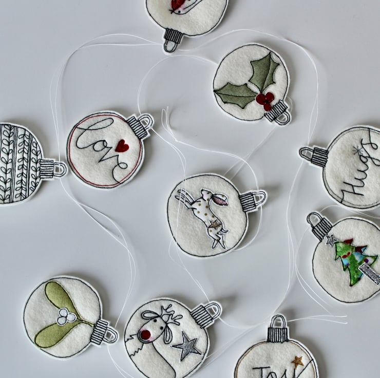 Each of the ten baubles suspended along this garland, is sewn using a combination of 100% wool felt, cotton cloth, glitter cloth and free hand machine embroidery; multiple layers of cloth are sewn together and cut out by hand using very sharp scissors.