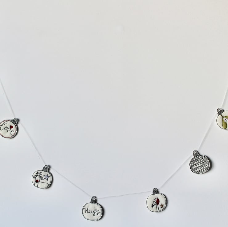 A handmade garland of Christmas baubles.