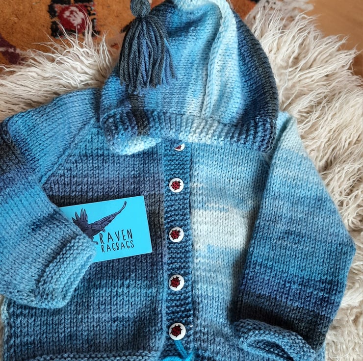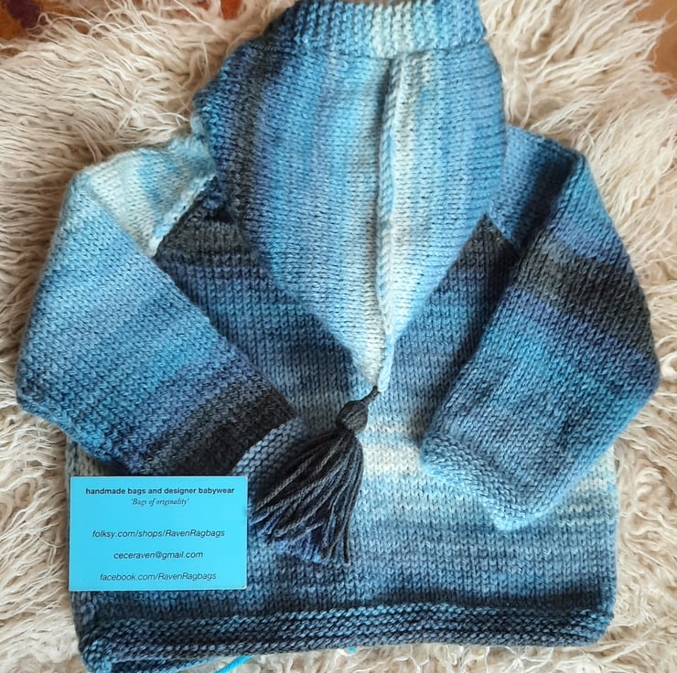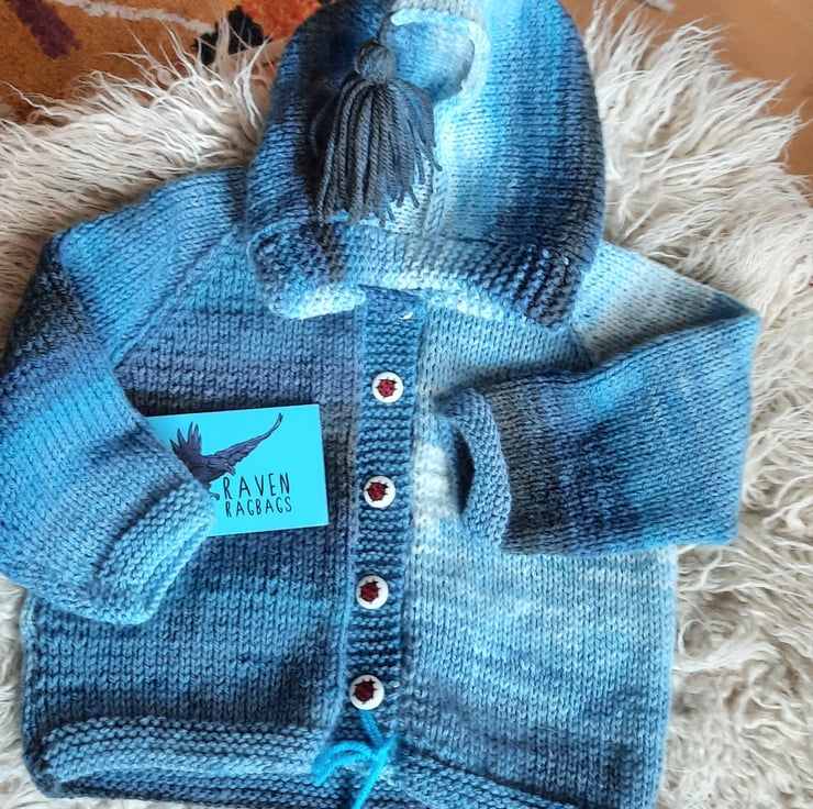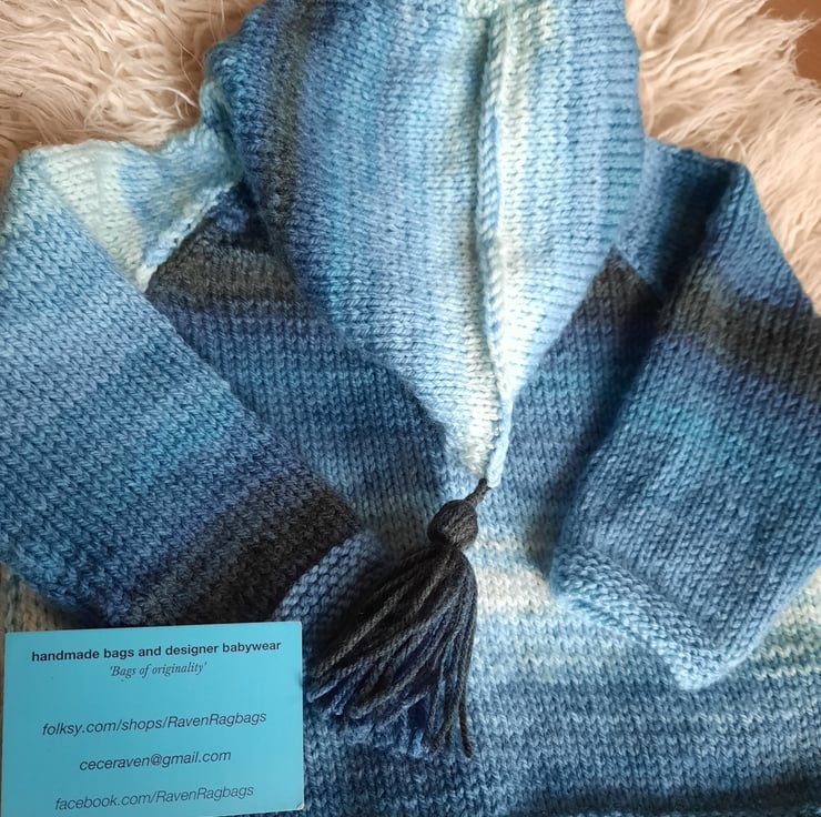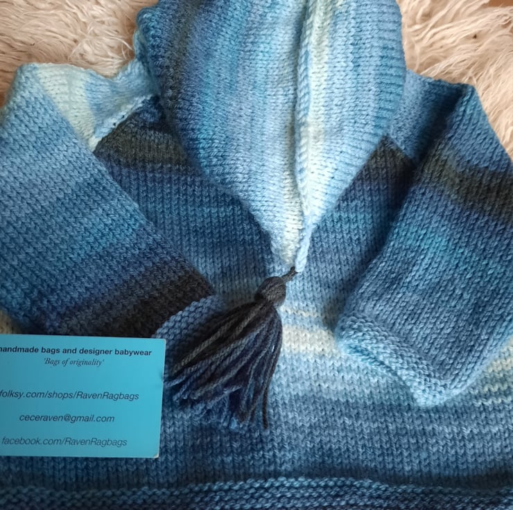 A beautiful little baby hoody handknitted in soft shades of misty blue in an acrylic and wool blend yarn. This gorgeous little jacket fastens with 5 ladybird buttons and the hood features a jaunty tassel. To fit appropriately 9 to 12 months with chest 20 to 22 inches back length 11 inches and sleeve length 7 inches. Can be washed at 30 degrees centigrade for easy care on a wool cycle.