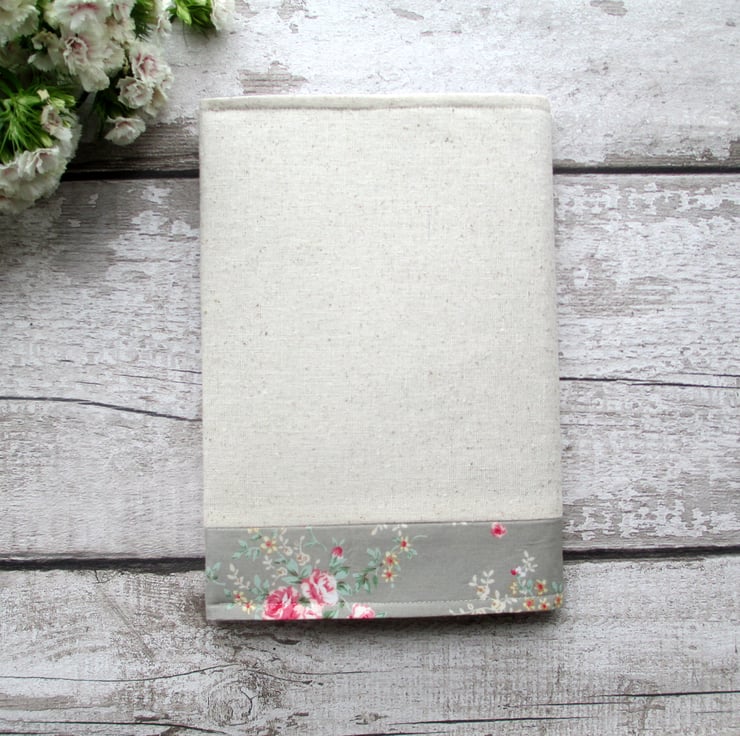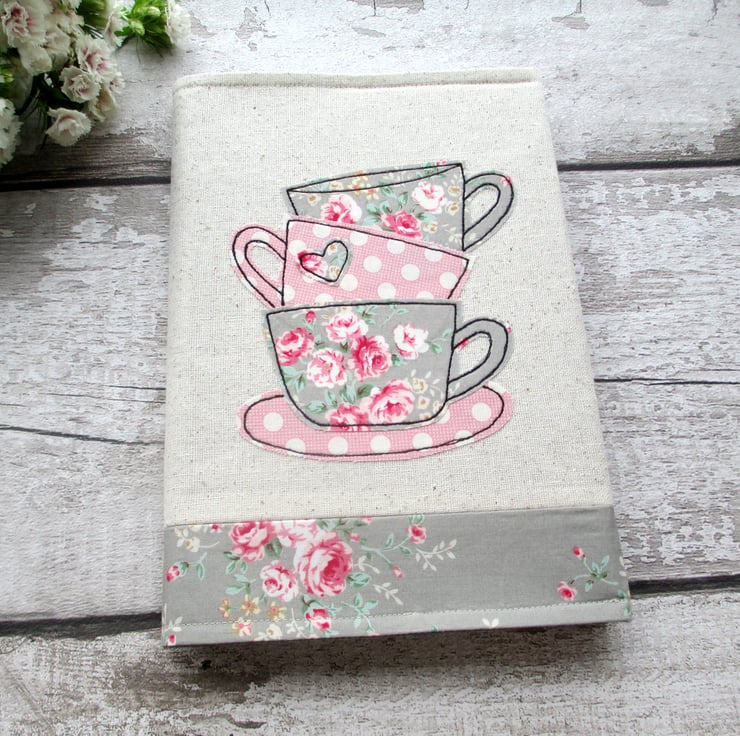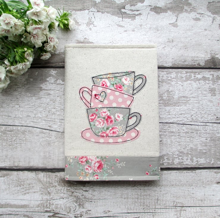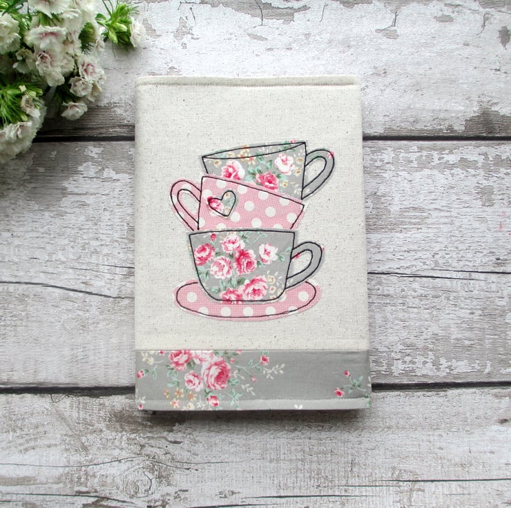 An a5 fabric notebook with a tea cup stack applique design in polka dot & floral fabrics, a cute gift idea for a tea lover!