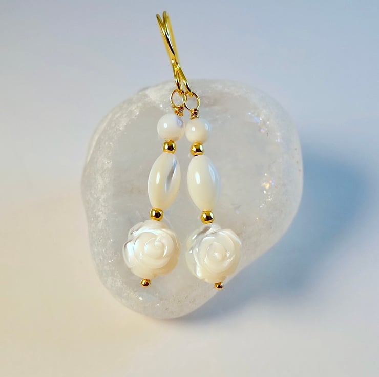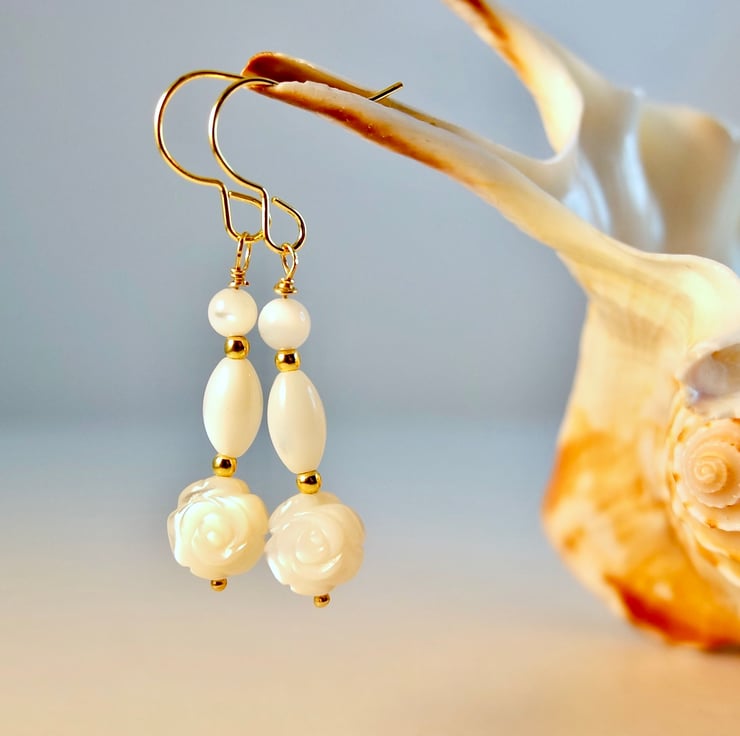 Each dainty earring features an 8x4mm Mother-of-Pearl focal bead in the shape of a rose, topped with an 8mm Mother-of-Pearl barrel bead and 4mm round bead, highlighted with tiny 2mm gold vermeil spacer beads.