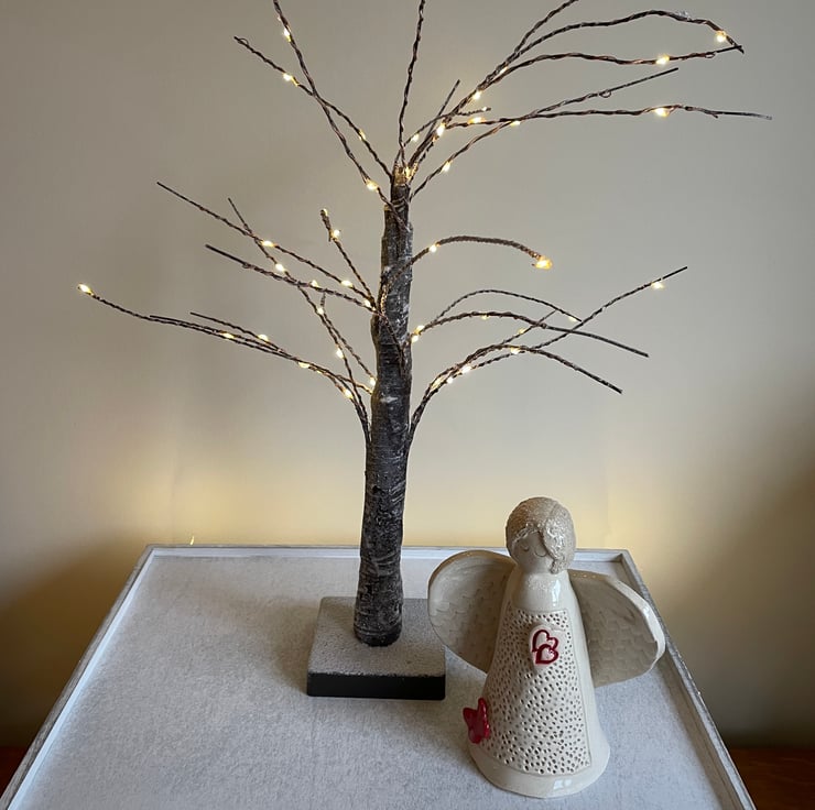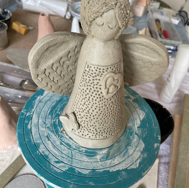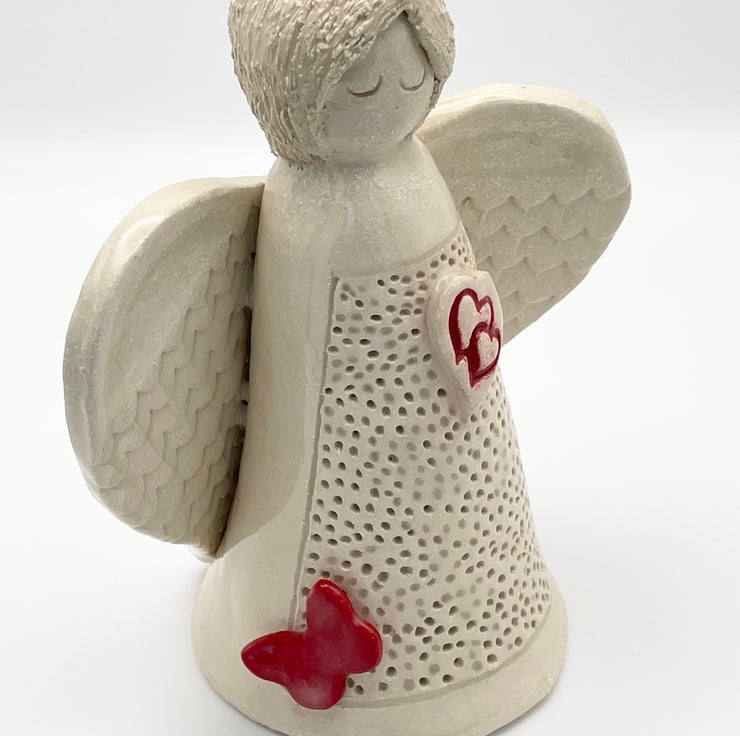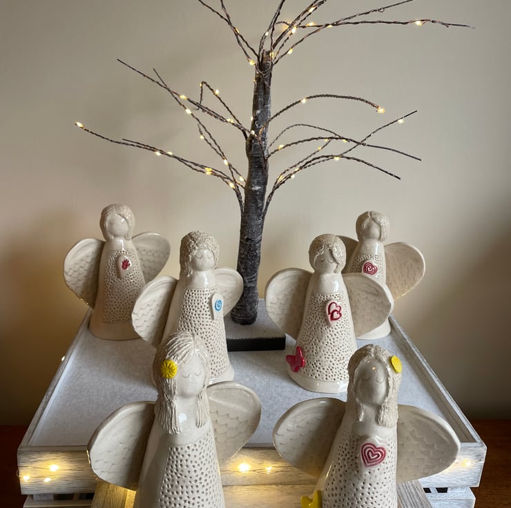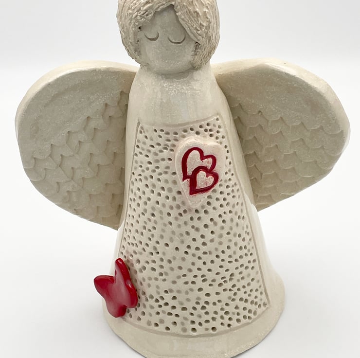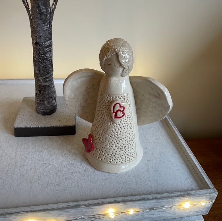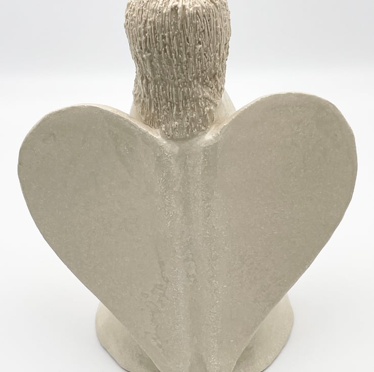 Handcrafted with white earthstone hand building clay using the slab and pinch-pot methods. Her gown is sculpted over a cone-shape mould. Her wings are cut out and embossed with a feather design, these are secured by to her body using “slip”. Her head is shaped using the pinch-pot method with her angelic hair added using sculpting tools. A stippled design enhances her gown together with the heart detail symbolising angelic love and a butterfly signifying change, transformation and joy!