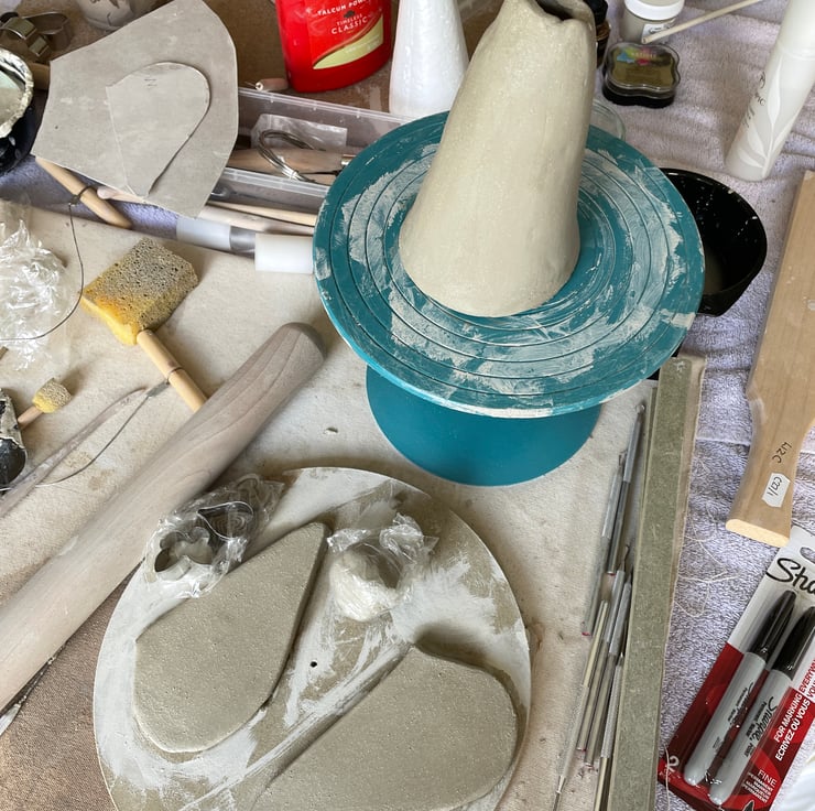 After the initial bisque firing to 1000c, she has been gently sanded to refine the finish before applying red underglaze glaze to the heart-shaped detail and butterfly. Three coats of clear glaze have been applied by brush before firing to a temperature of 1180c.