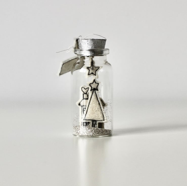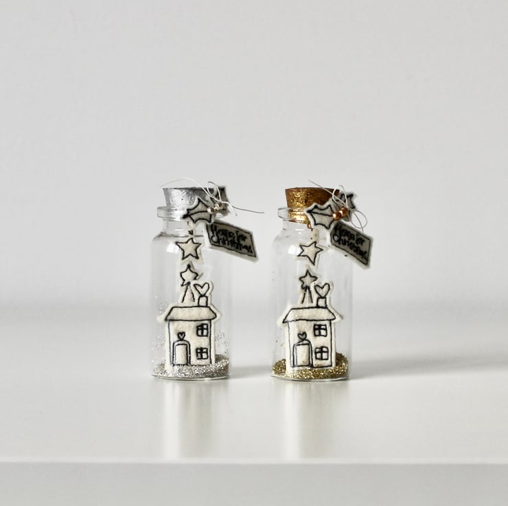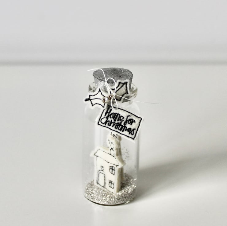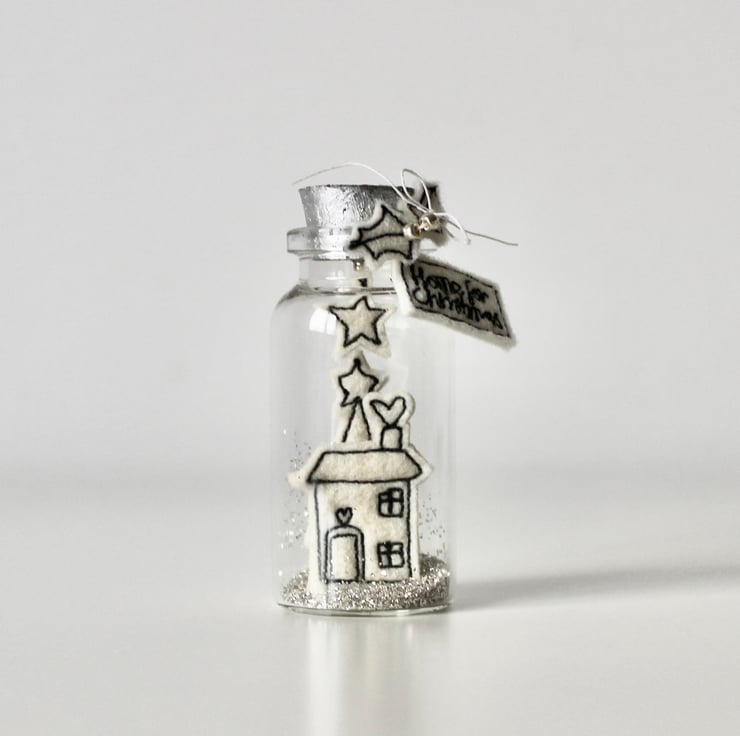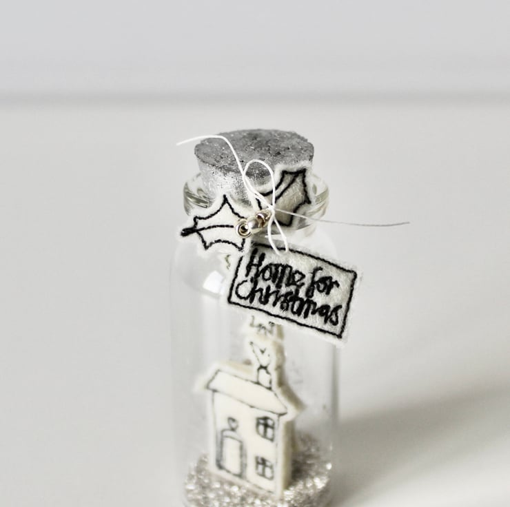'Home for Christmas' is created using 100% cream wool felt and free hand machine embroidery. There is sewn holly and three metallic glass beads around the bottle neck and a silver hand painted cork.