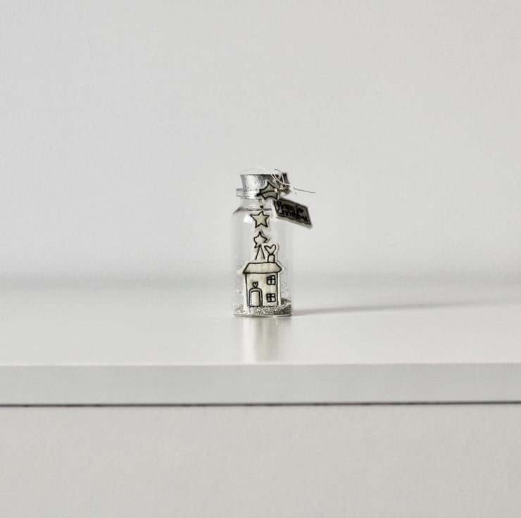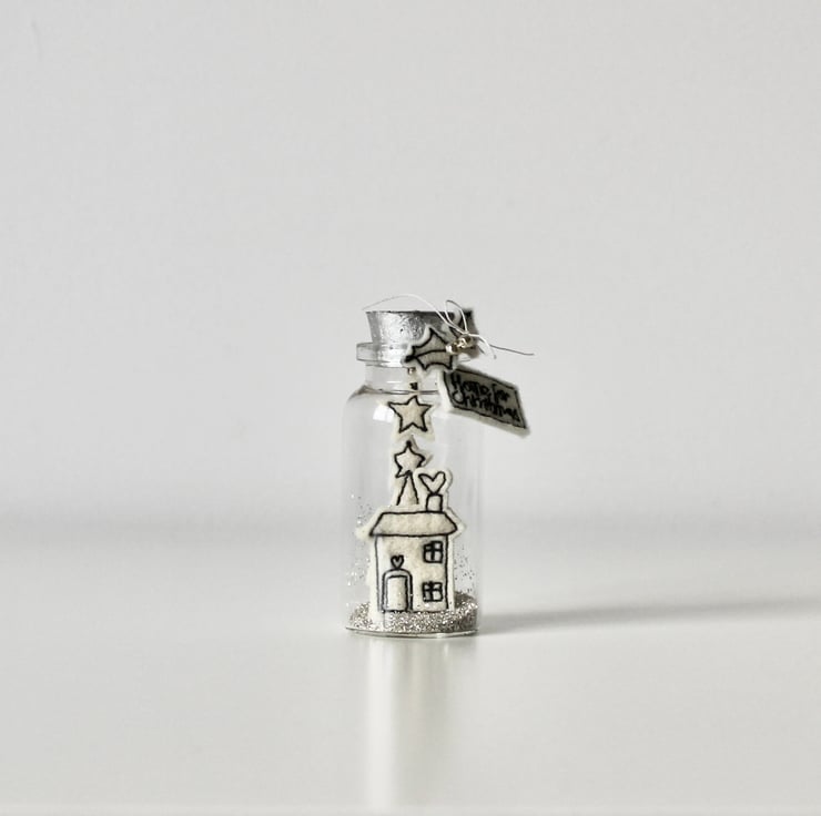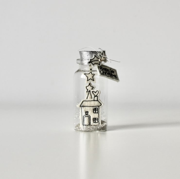 A little house and Christmas tree are surrounded by snow (not real snow, sorry, its glass glitter!), with a star above.