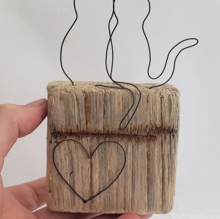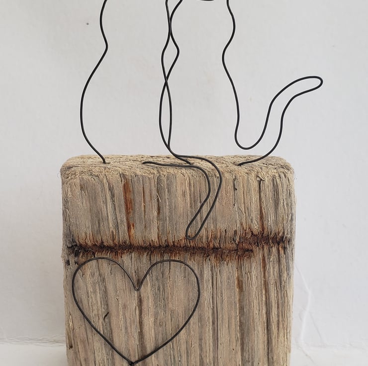 Two wire cats set on a piece of driftwood from the Jurassic coast, with a wire heart on the driftwood base. Perfect gift for anyone who owns two cats.