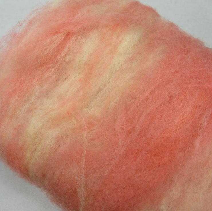 The fleece was cleaned, washed and carded here in North Wales before being kettle dyed with weld flowers and madder roots to give a blend of reds and yellows