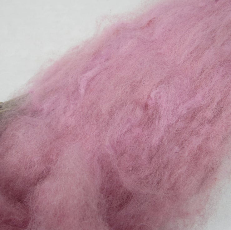 The fleece was cleaned, washed and carded here in North Wales before being kettle dyed with cochineal to give a light petal pink