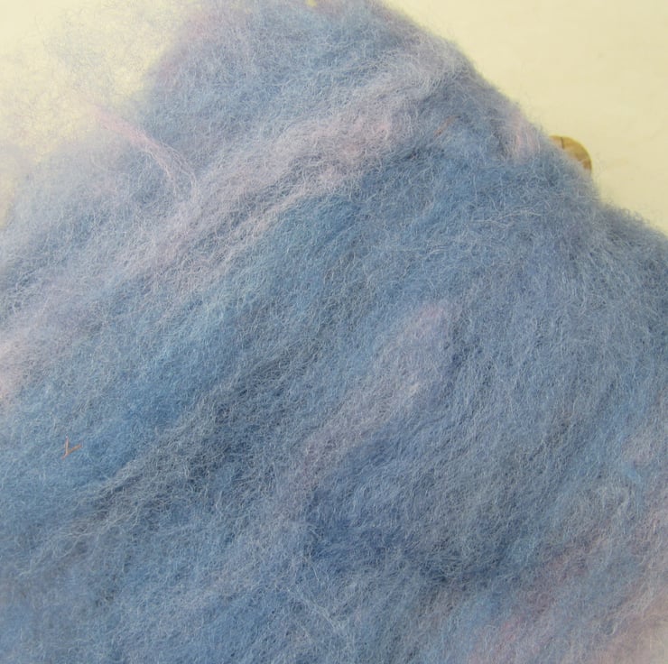 The fleece was cleaned, washed and carded here in North Wales before being kettle dyed with indigo and cochineal to give a mix of blues and purples