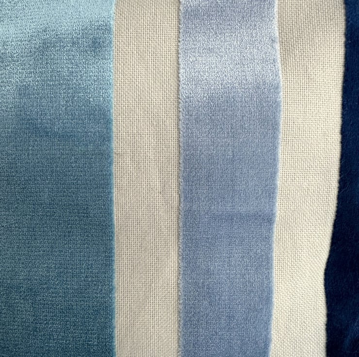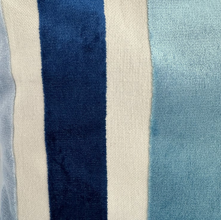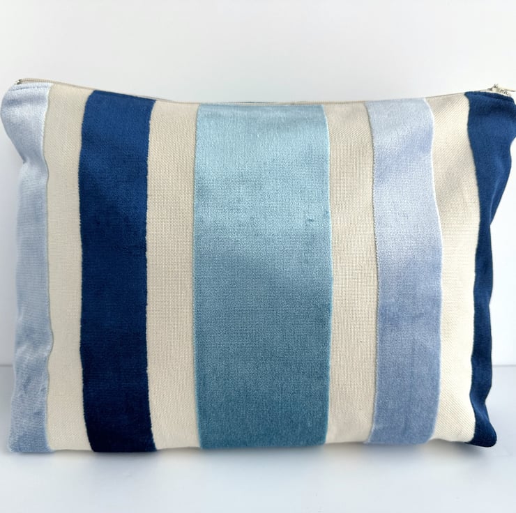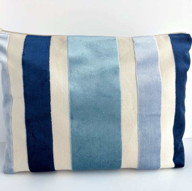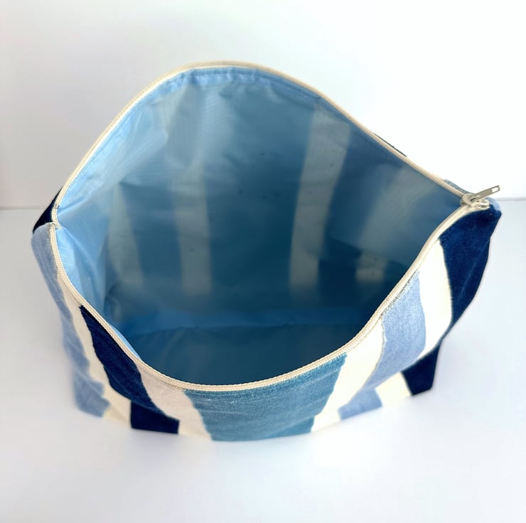 Toiletry bag with textured velvet stripes. This stylish toiletry bag is made from a gorgeous textured striped fabric in shades of cream and blue. The luxurious velvety stripes are dark blue, a pale icy blue and a lovely turquoise. The stripes are different widths and they are slightly raised above the cream stripes, which resemble a cream canvas. The wash bag fastens with a matching cream zip and the inside is lined with pale blue water-resistant fabric. The base of the toiletries bag has been squared off to give lots of room inside for all those essential toiletries.