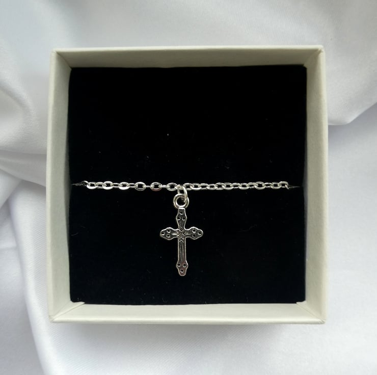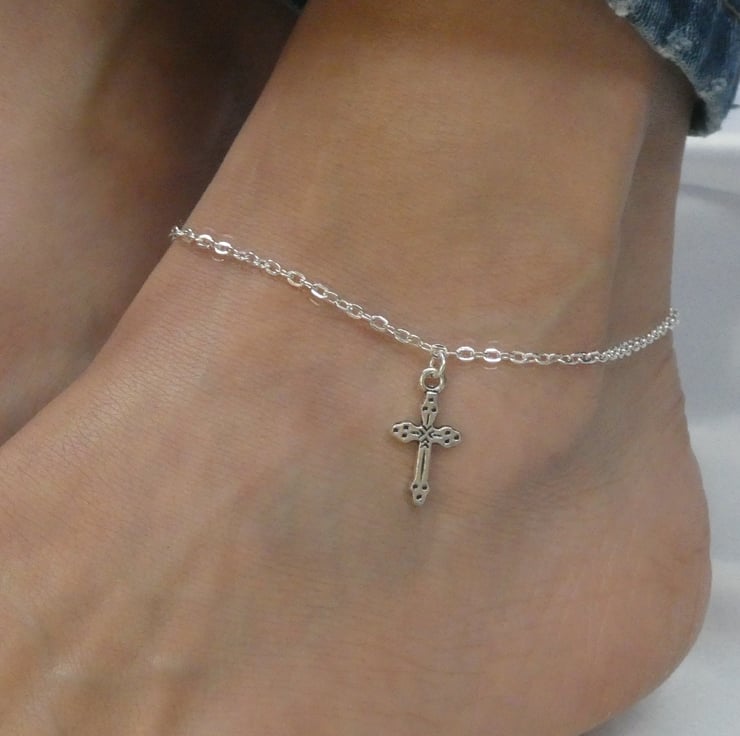 This listing is for an elegant cross ankle bracelet. It comprises a beautifully detailed silver plated cross charm on silver plated chain. The anklet closes with a silver plated lobster clasp and has a small extender chain attached.