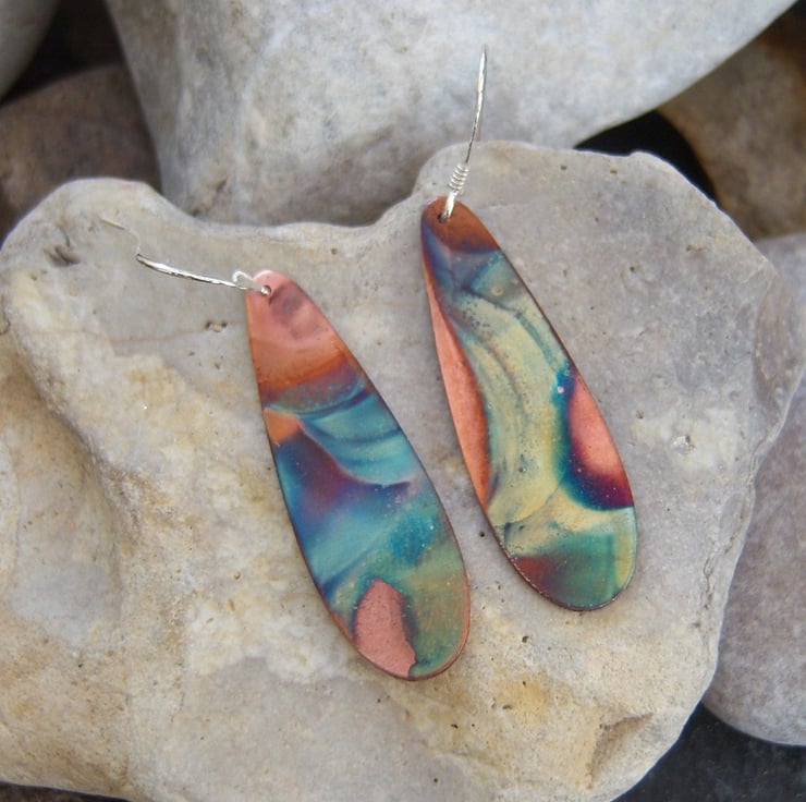 The copper has been been flame painted. This is a technique that produces a one-of-a-kind effect as you can see, the pattern will not be replicated so they do not match. It is done with a micro torch, producing different hues of blue, green, pink, purple, brown, gold with each firing.