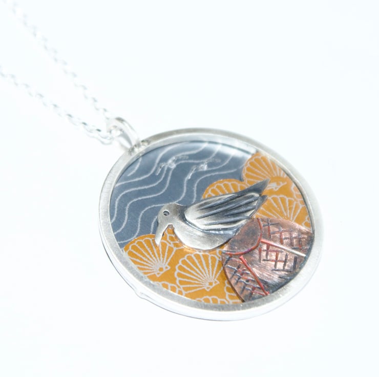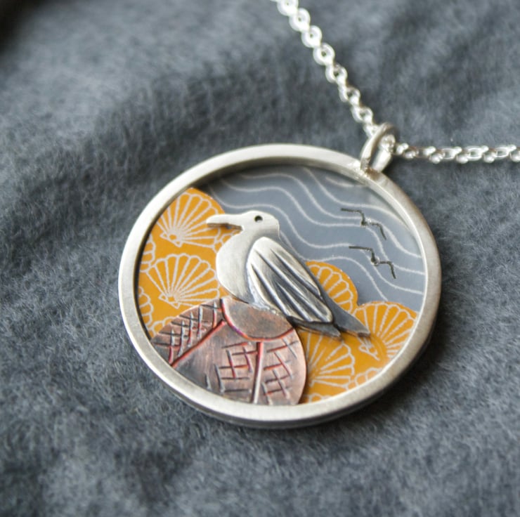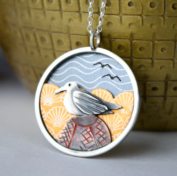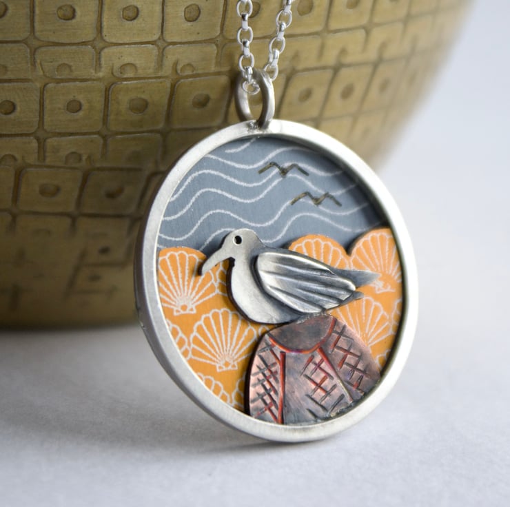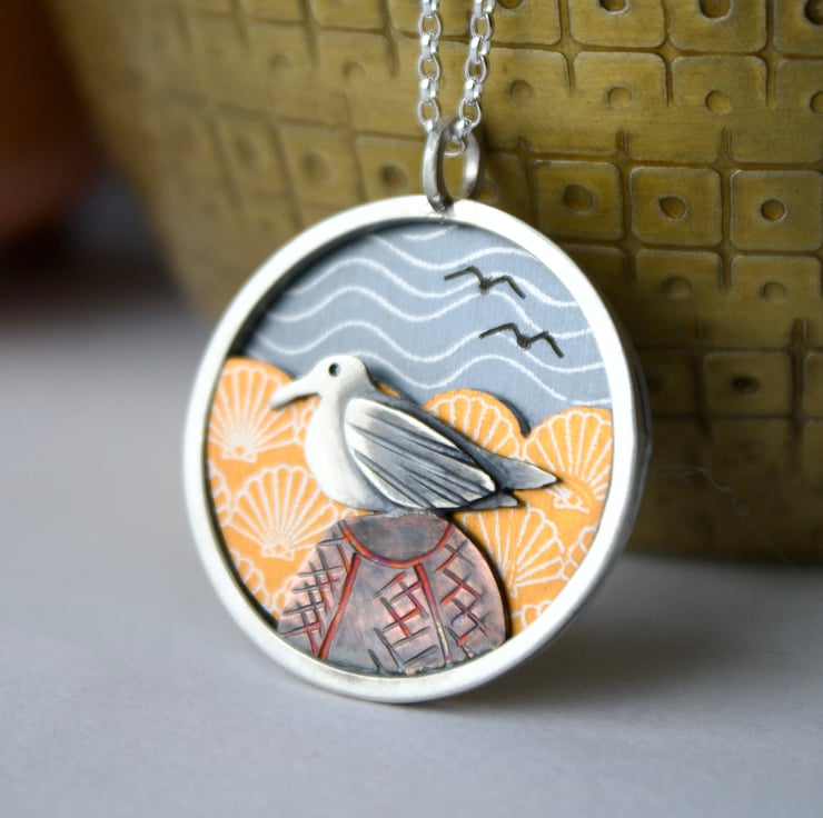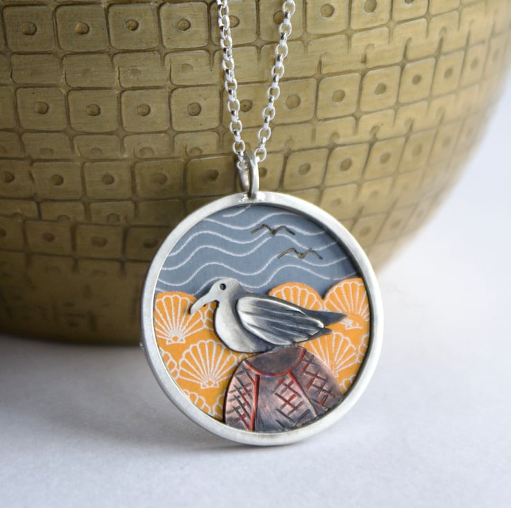 Guaranteed to make your smile, this lovely necklace is a reminder of our summer coastline and the gulls that lie in wait for our lunch! It features a seagull sitting on a lobster pot within a beach landscape. This necklace is made from anodised aluminium, sterling silver, and copper, and each piece has been carefully cut with a piercing saw and constructed in layers. The seagull is made from sterling silver which has been oxidised and rubbed back. The coloured aluminium pieces are patterned with a resist and immersion dyed. Hung from an 18 inch sterling silver chain. (Other lengths available).
