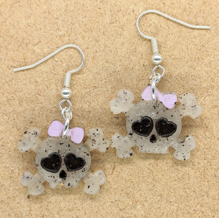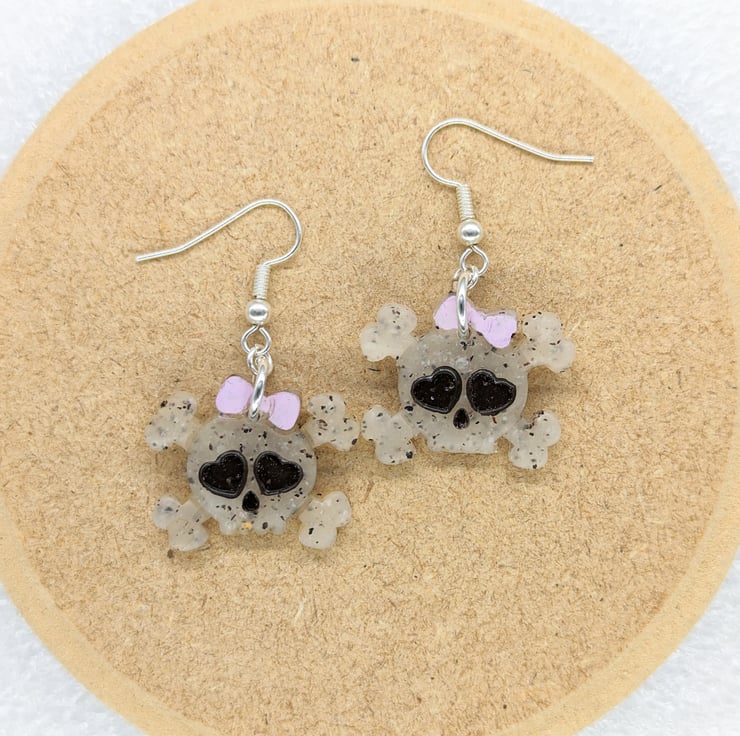A delightful pair of skele bone earrings with a cutesy bow made from polymer clay.