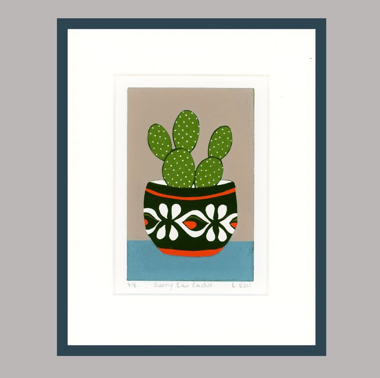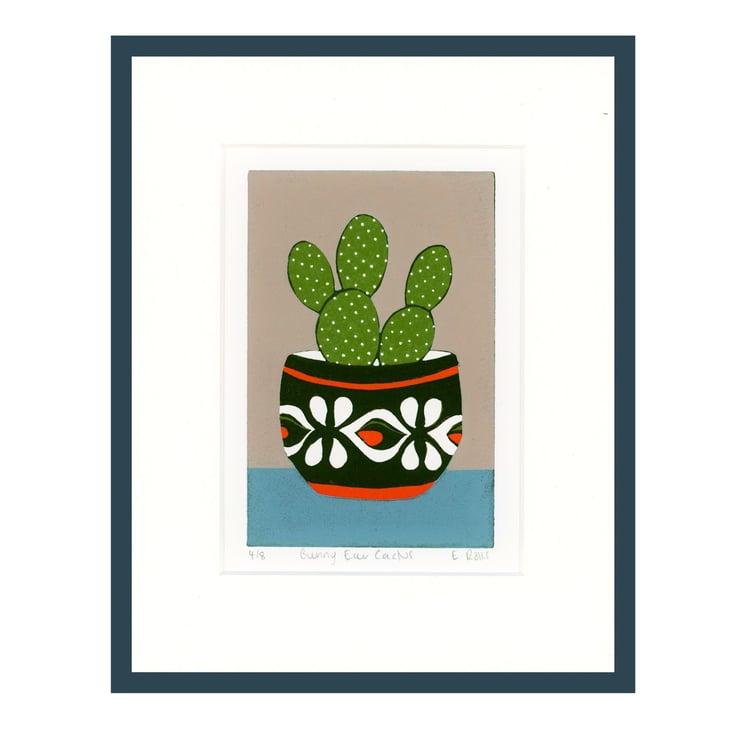 This is my six colour reduction lino print of a Bunny Ear Cactus in a mid-century pot,