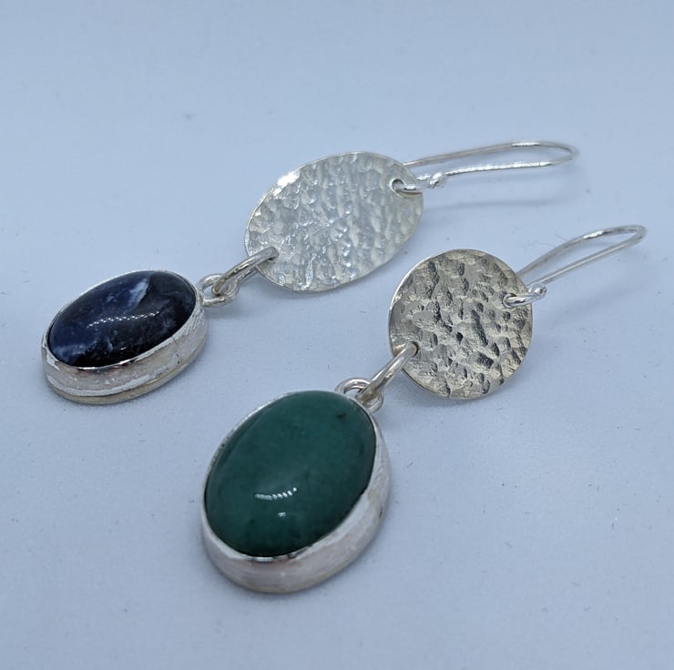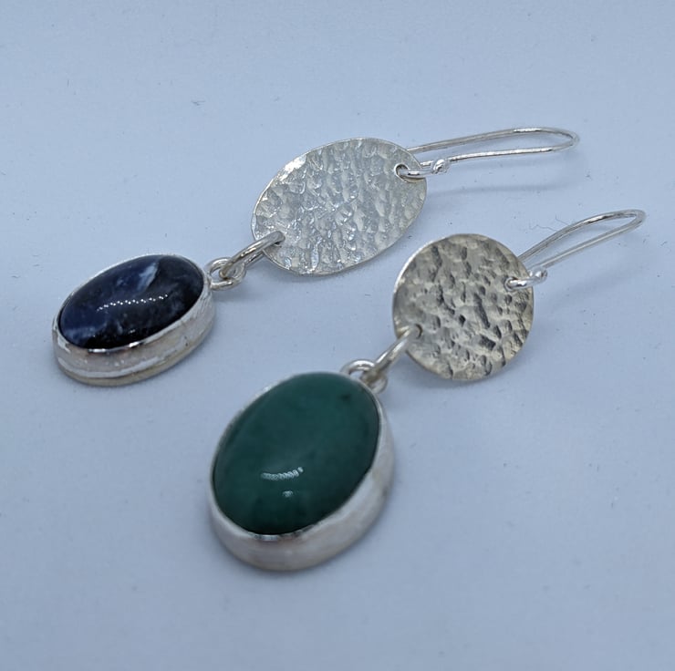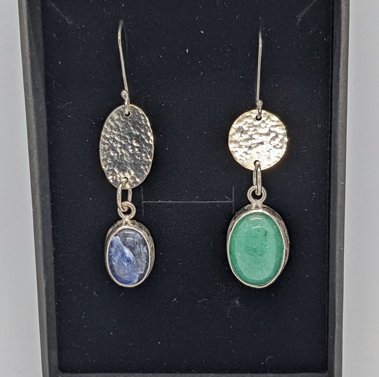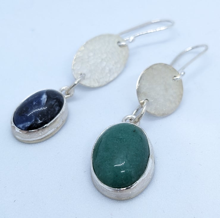 These asymmetrical earrings combine mismatched oval and circular sterling silver hammered discs with mismatched oval stones. The stones are green aventurine and blue sodalite. These unique earrings have a 4cm drop. They hang from handmade earwires.
