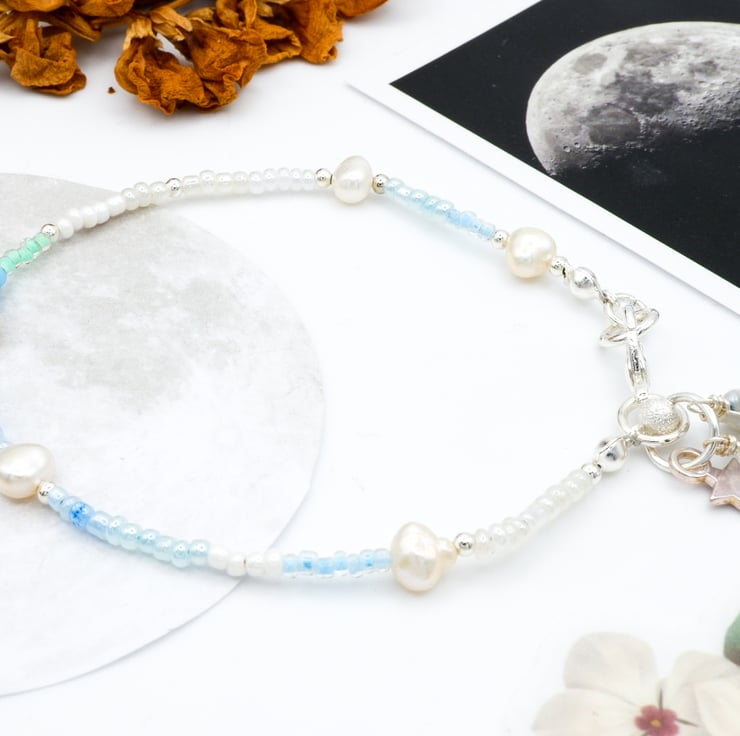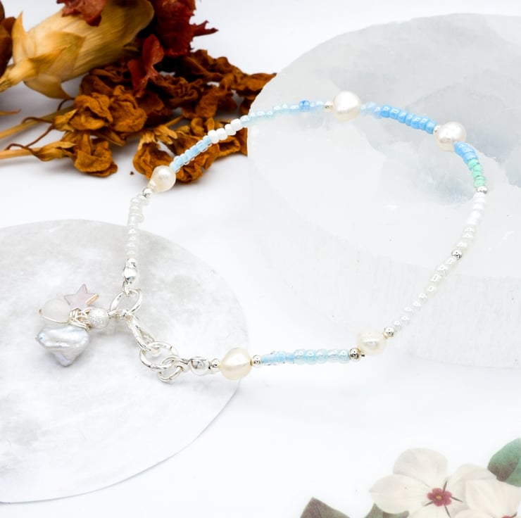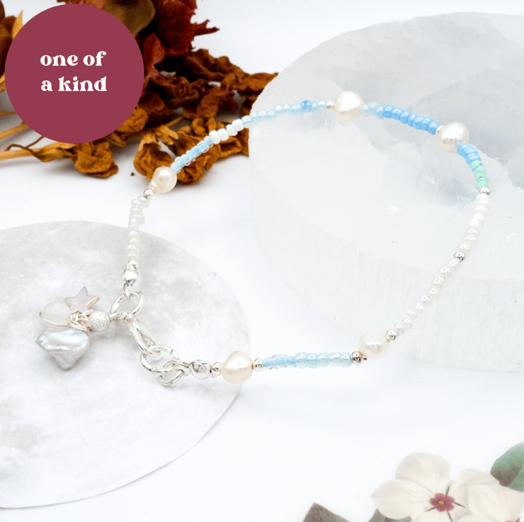 We've used sterling silver components, including accent beads, freshwater ivory baroque pearls, a light blue baroque pearl charm, a crystal quartz gemstone charm, and a celestial-inspired silver star.