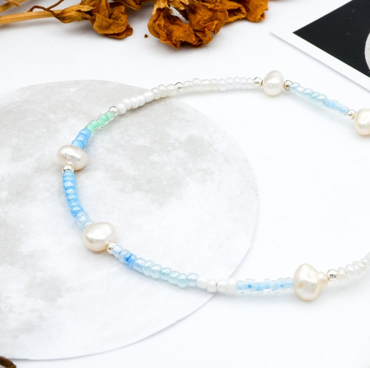 Quality Czech glass seed beads have been used in complementary blues and whites.