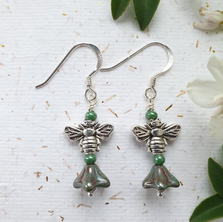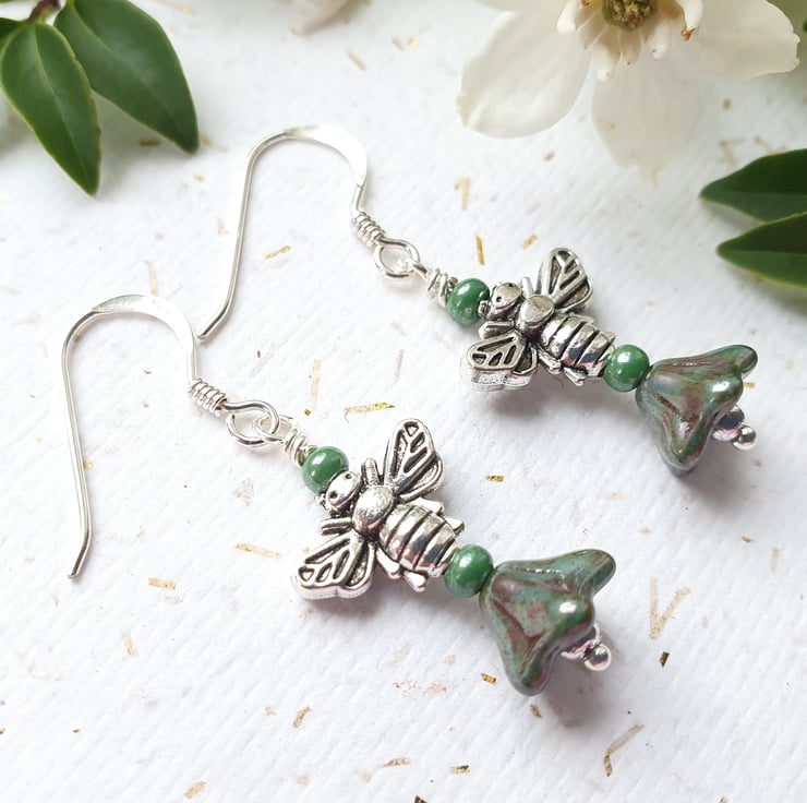 Little butterflies above mottled green glass flower beads. Sterling silver ear wires.
