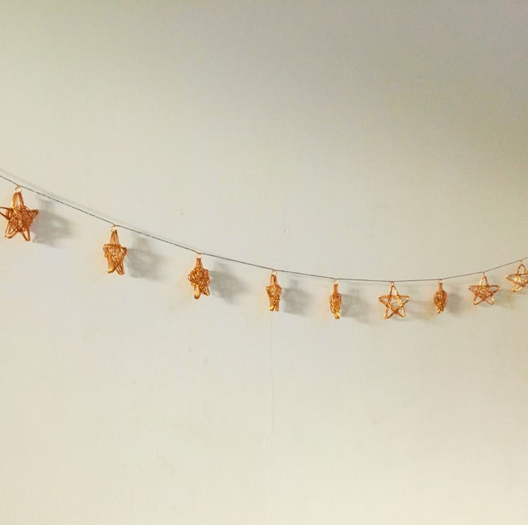 The garland consists of 15 individually handmade wire stars, hung on a metallic silver twine. Each star is made from copper aluminium wire, and measures 5cm high and 5cm wide.