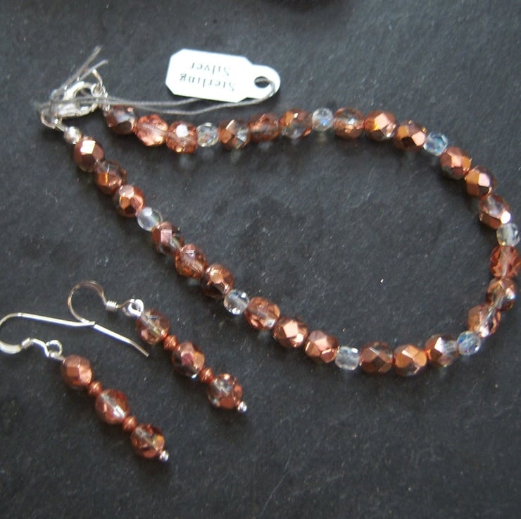 Matching bracelet and earrings. 6mm copper & clear Czech fire polished glass beads. All sterling silver ear wires, fastener and connections.