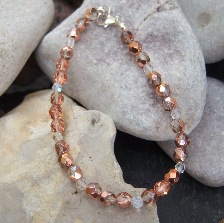 The bracelet is 22cms (8.5 inches) long and has 4mm clear faceted crystals between sets of 3 6mm copper/clear beads, threaded on double nylon wire for extra strength.