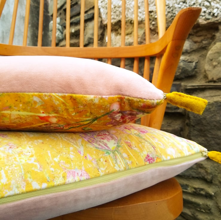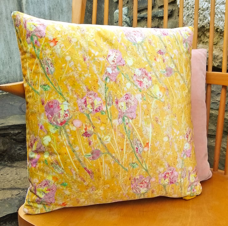 A pair of velvet cushions featuring my original 'Summer Garden' design printed onto a soft velvet by a company in the UK. Backed in a vintage velvet and fully lined in satin, with a zip fastening, these make a colourful addition to any room.