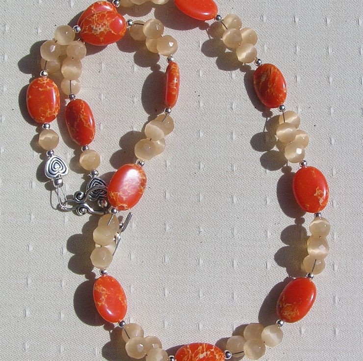 This Stunning Necklace is made from Orange Sea Sediment Jasper Oval shaped beads separated by Pale Orange Cat’s Eye faceted rounds beads, clustered together in four’s and for that added bit of sparkle tiny Silver spacer beads - The wondrous Marbling effect within the Jasper ensures that no two beads are ever the same - a Glistening sophisticated effect that will look stunning either worn casually or with something more Elegant for a Special Evening out