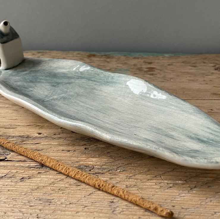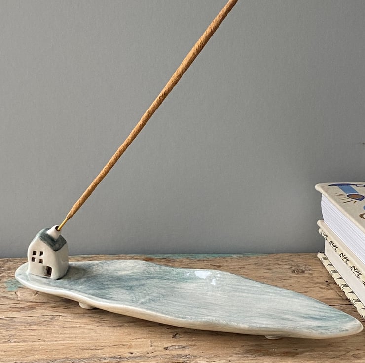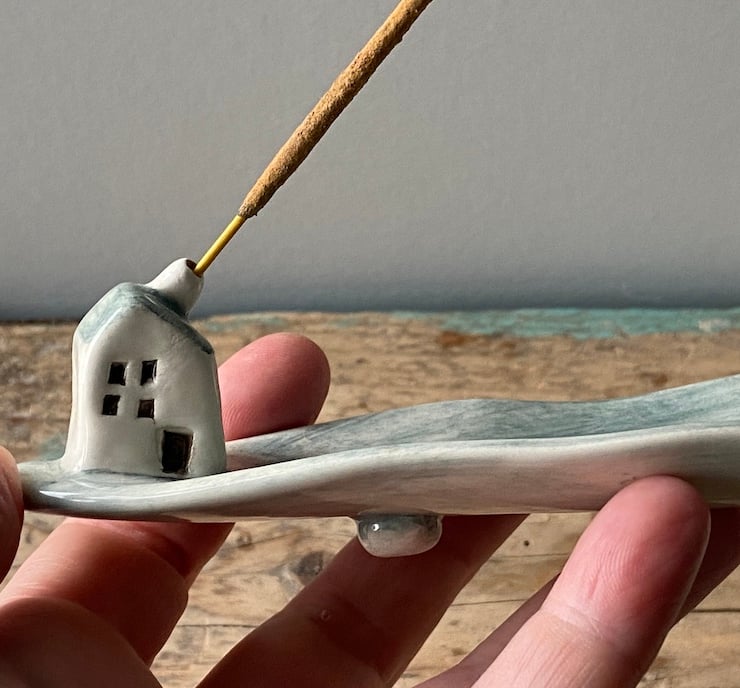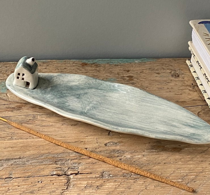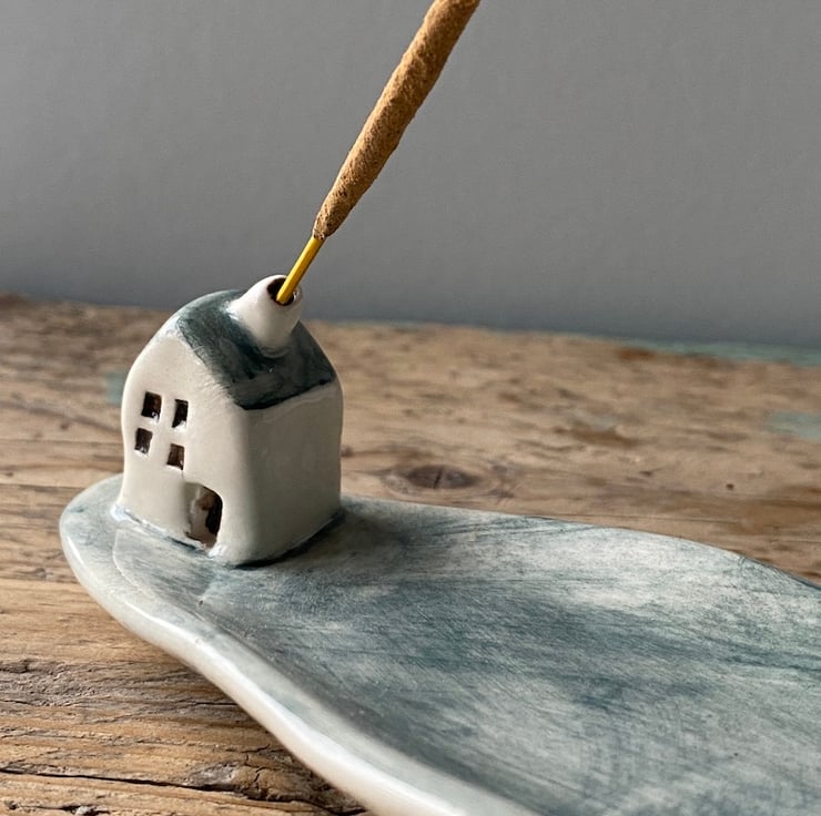 Handmade Leaf shaped Incense Holder with a charming little cottage.