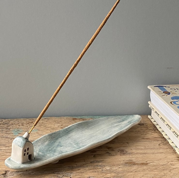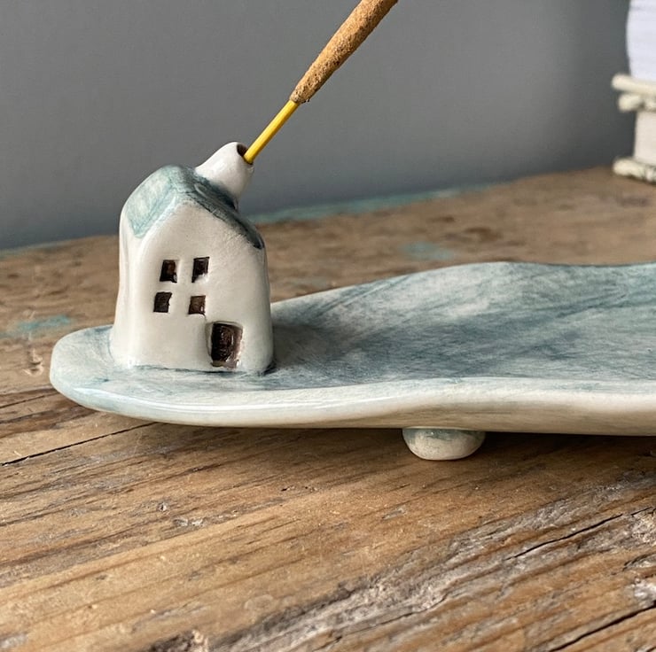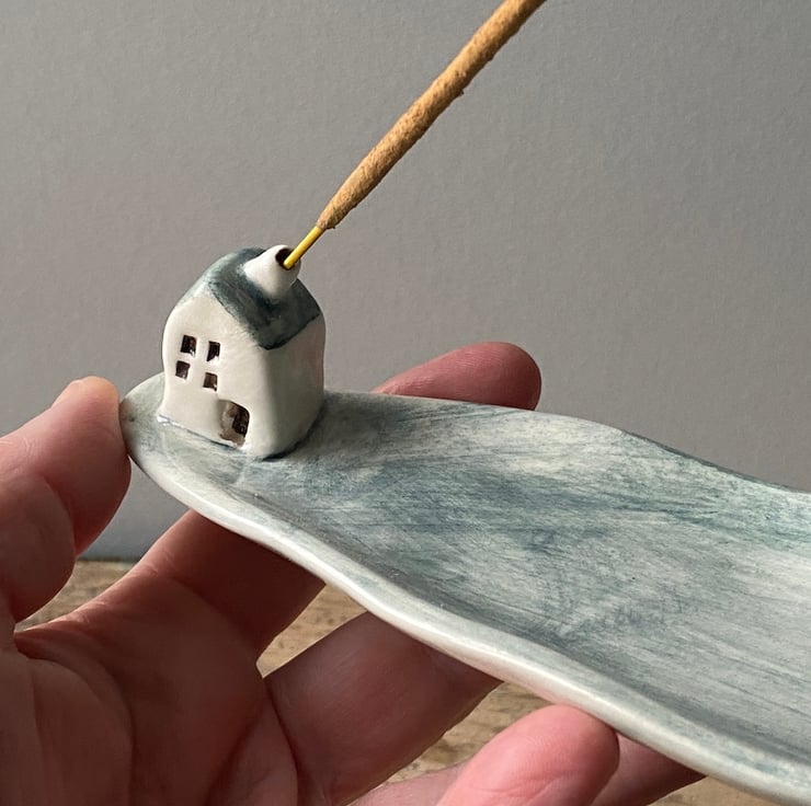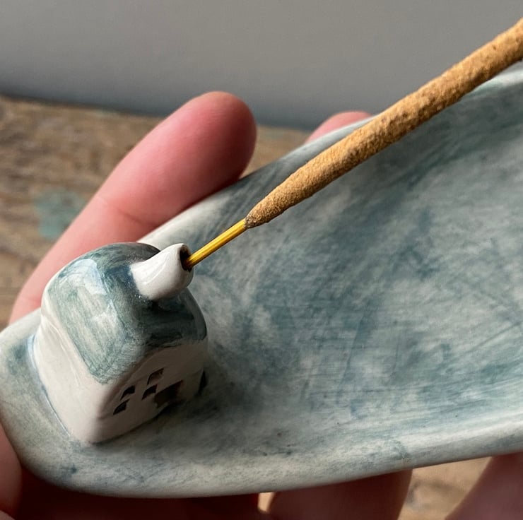 An incense stick sits in the cottages chimney and any ash is caught by the tray.