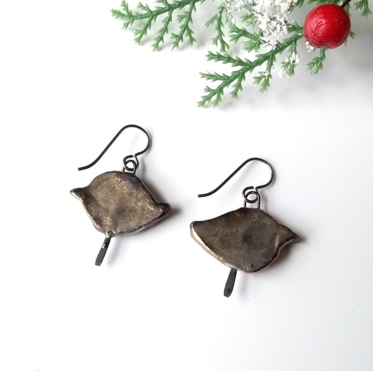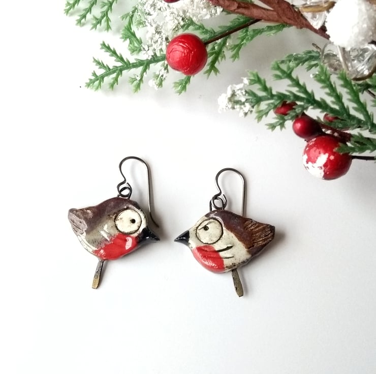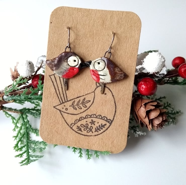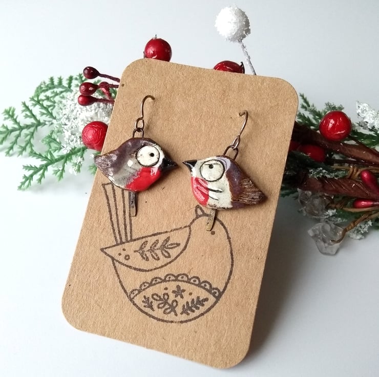 Fun and quirky slightly mis-matched robin earrings, featuring ceramic components by Petra Carpreau. Each robin is unique - one looks happier than the other, I think!