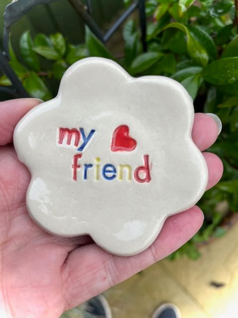 The wording is impressed in bright coloured glazes – red, blue, yellow – with a pretty red heart.