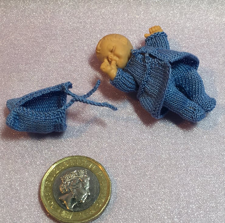 Here is a 1 1/2th scale rubber baby dressed in a fully removable 3 piece pram suit in blue. It’s a little fiddly to re-tie the thread through the waist of the leggings, if you do undress the baby,but it can be done.