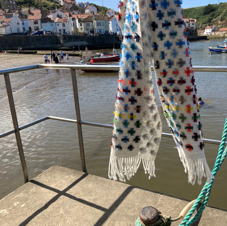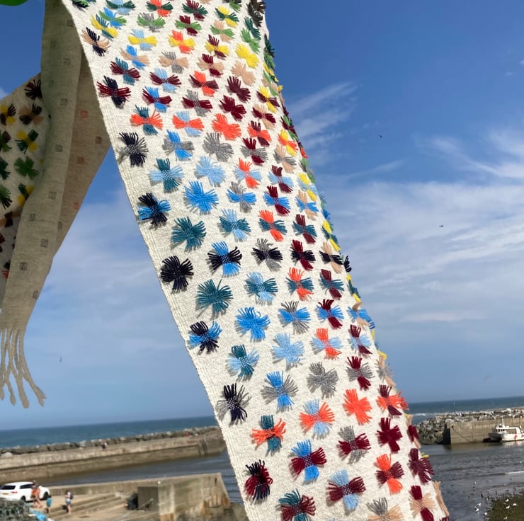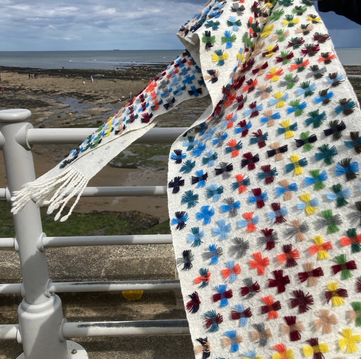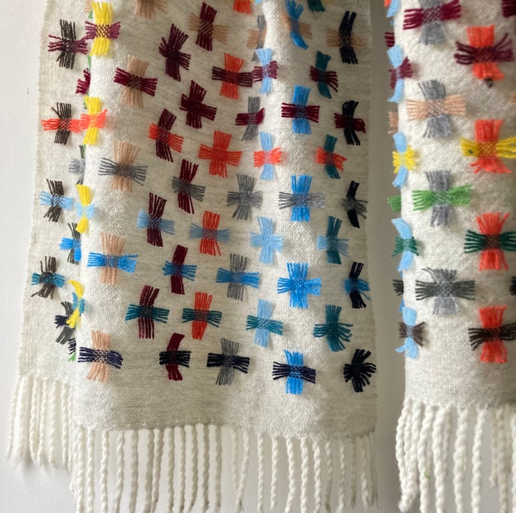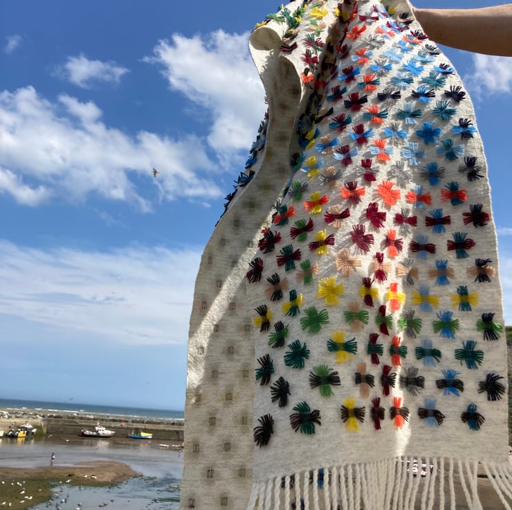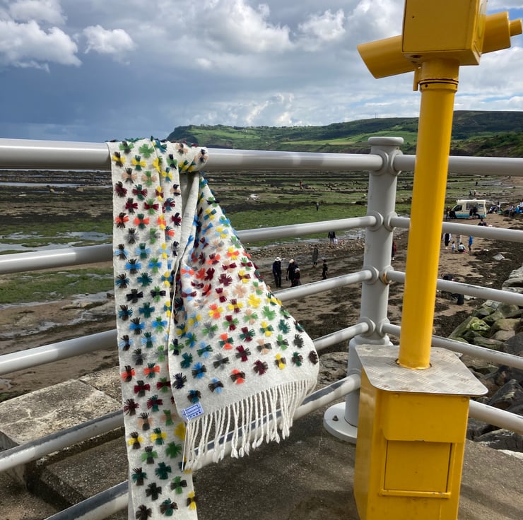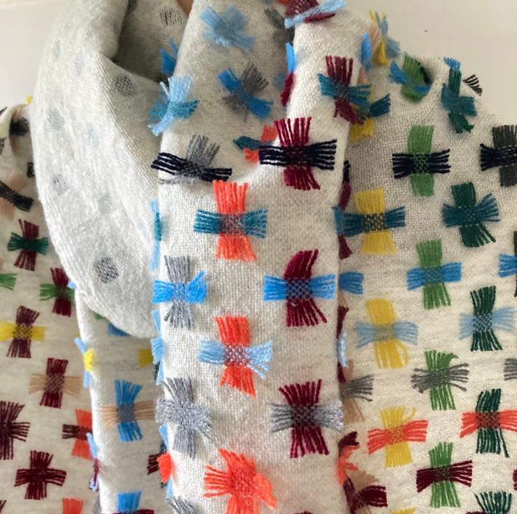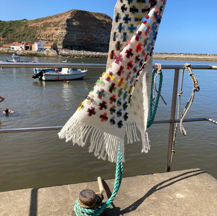 A handwoven wrap scarf inlaid with in 14 shades of Staithes on the North Yorkshire coast. A unique draft to celebrate the joys of Staithes in winter. Each square is cut to form tiny tassels squares. The colours are repeated across the weft to produce visual blending- no two blocks are the same across the repeat.Soft and supple, the square wrap is light and warm, and large enough to loop around your neck. The reverse is a beautifully-subtle chequered pattern, so the scarf can be worn two ways. The colours are taken from many photographs of this beautiful place to capture the spirit of this gem of a village.