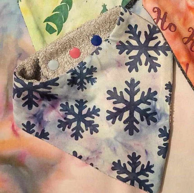 A gorgeous Festive bib, hand stencilled and ice-dyed with Snowflakes. These are made from Bamboo Jersey and Bamboo Terry Towelling; incredibly soft and absorbant fabrics, perfect to catch the dribble around little necks, with the added advantage of being more eco-friendly than cotton. Each are entirely unique, with the addition of colourful poppers which allow these to be altered from Tiny to Toddler!