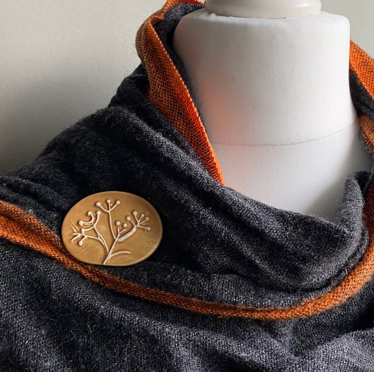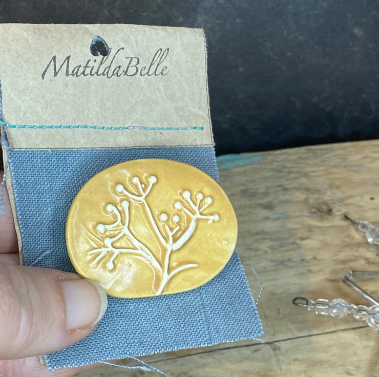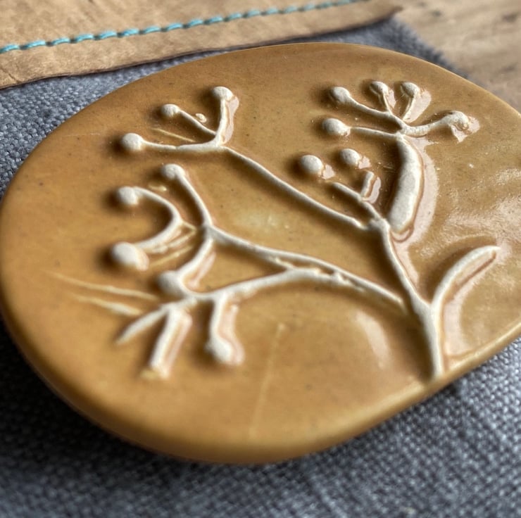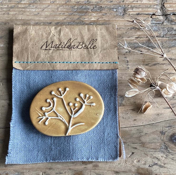 Naturalistic Brooch Inspired by the over wintering seed heads in the garden surrounding my home studio. This beautifully simple brooch as been imprinted with a carving of swaying seed heads. Glazed in a rich Ochre really fitting to the design.