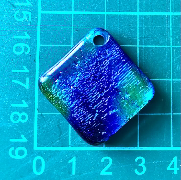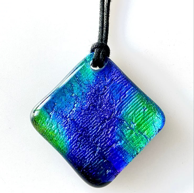 This hand-cut multicoloured glass pendant was made by fusing a clear layer of glass on top of patterned dichroic glass to create this stunning coloured shimmering pendant. It was fired at 800 degrees Celsius in a specialist glass kiln and gently cooled over a 12 hour period. A hole was drilled in one corner to hang it as a diamond shape which measures estimated 3cm diagonally or 2.5cm square.