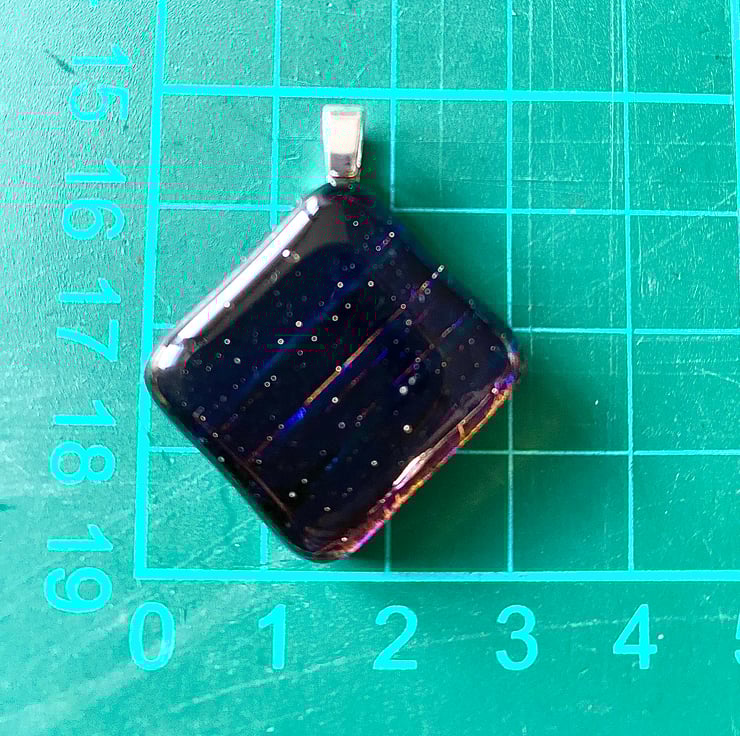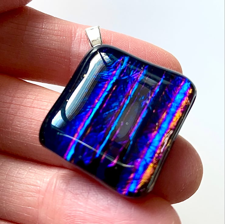 This hand-cut multicoloured glass pendant was made by fusing a clear layer of glass on top of a ribbed piece of dichroic glass to create this stunning coloured shimmering pendant. It was fired at 800 degrees Celsius in a specialist glass kiln and gently cooled over a 12 hour period. It’s an intriguing piece of glass which appears like the midnight sky at one angle, but adjust it towards the light and ribbed colours of neon blue, purple, violet, midnight blue and black reveal themselves. A bail has been attached to a corner to hang as a diamond shape which measures estimated 3cm diagonally or 2.3cm square.