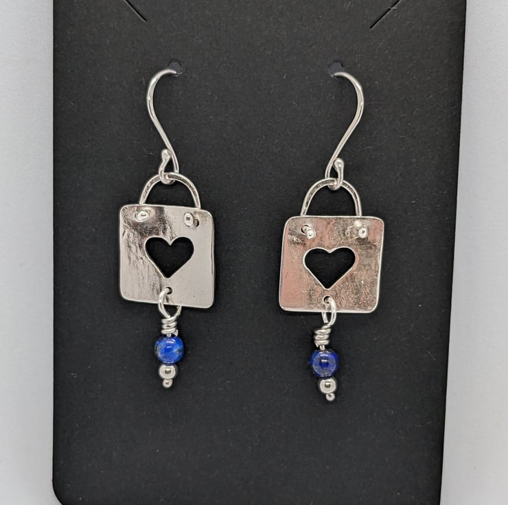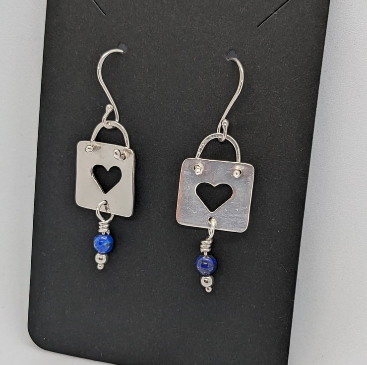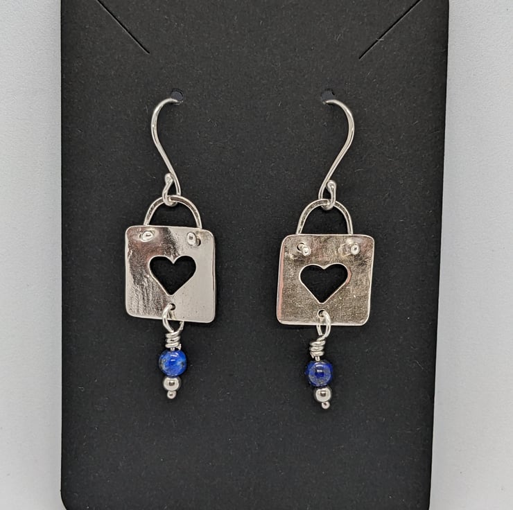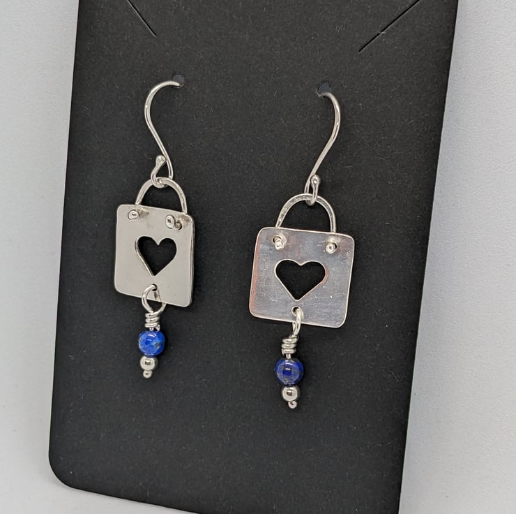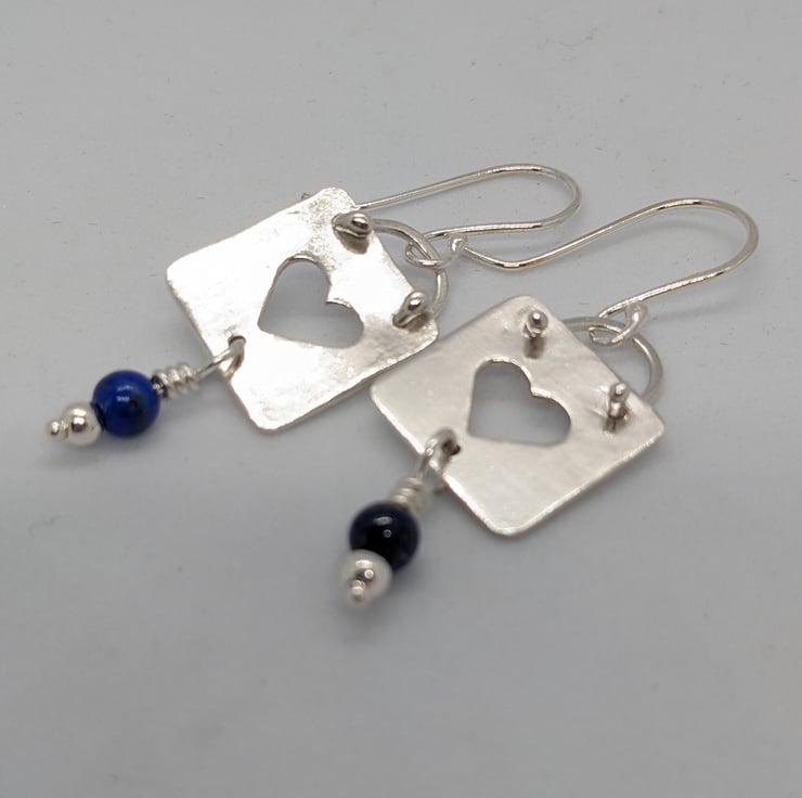 These original sterling silver square earrings feature a 'handbag' style hoop that allows them to hang from the ear wires. Each one has a hand saw pierced cut out heart. One lapis and one silver bead hang from each earring on a handmade headpin. They would make a sweet and unique handmade jewellery gift for someone special.