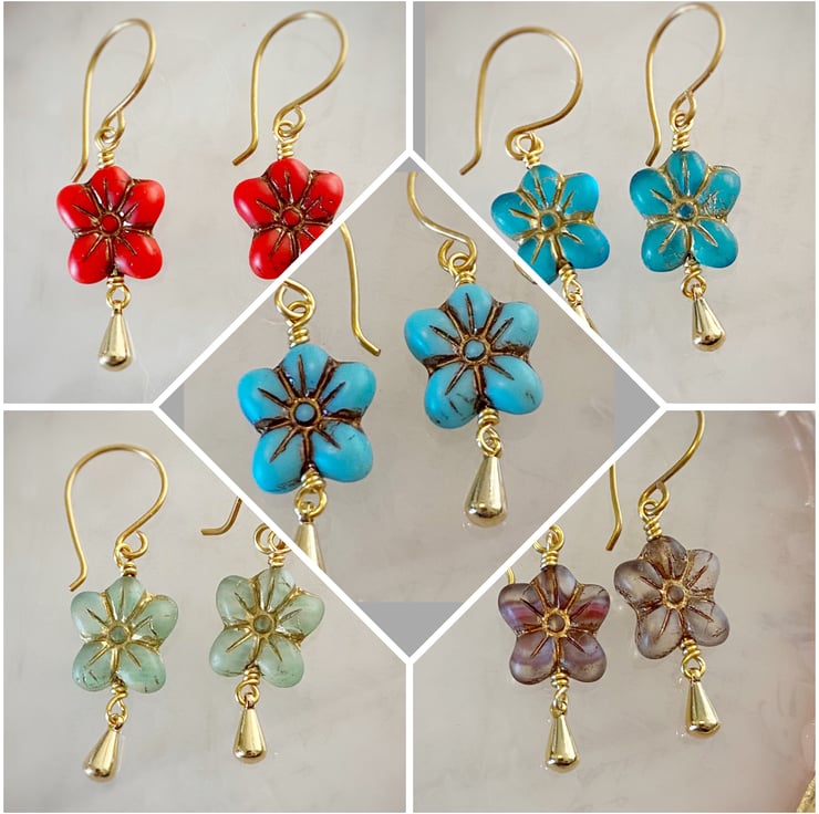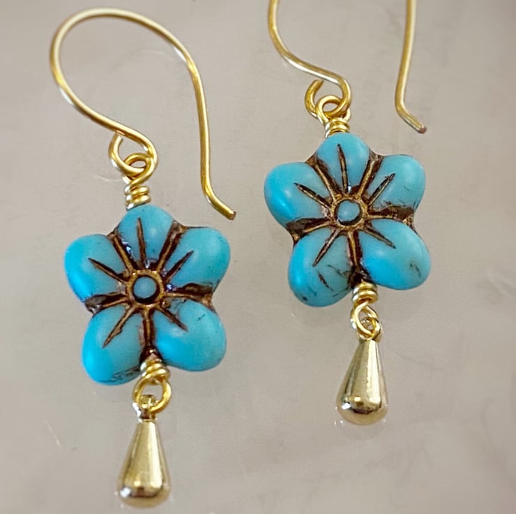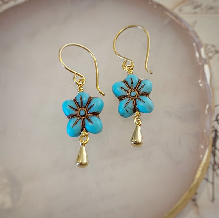 Turquoise flower earrings with a gold plated teardrop charm which hangs from handmade ear wire hooks.