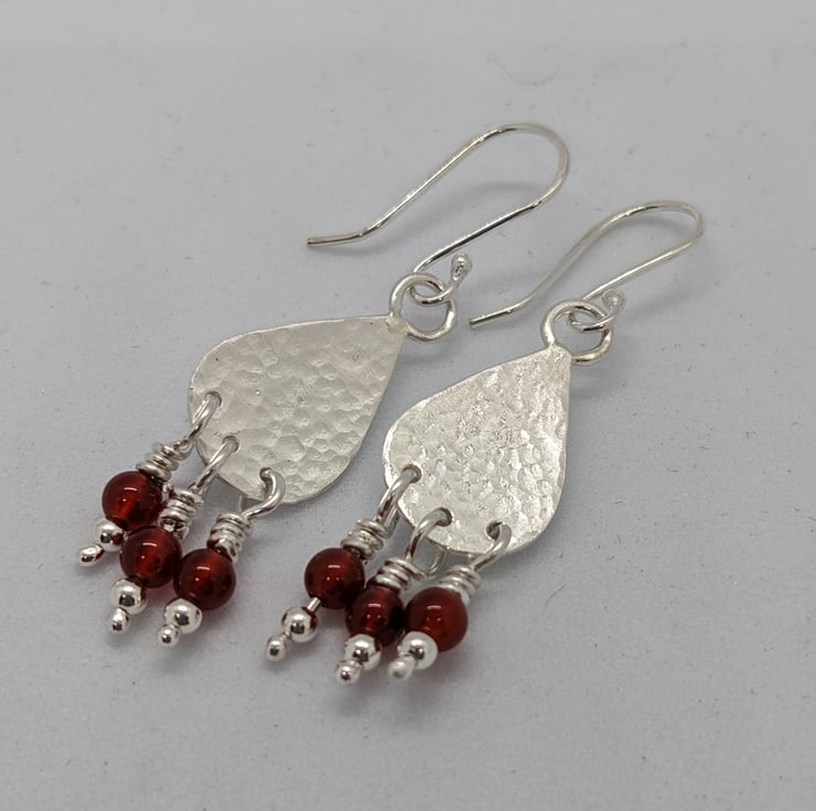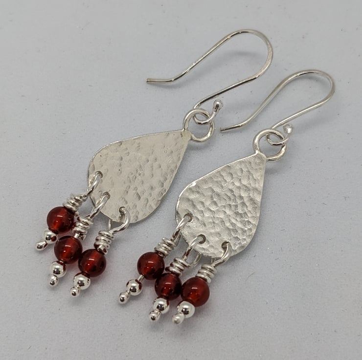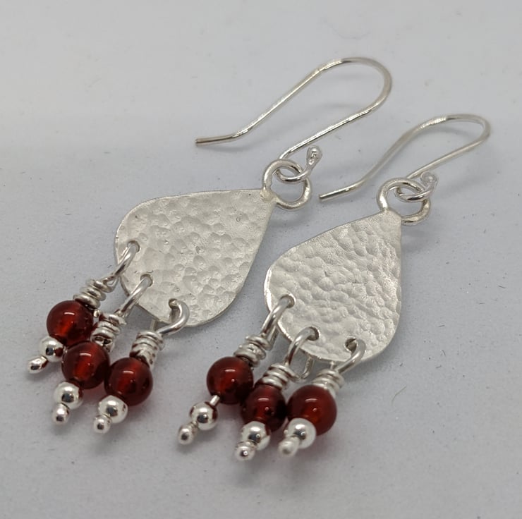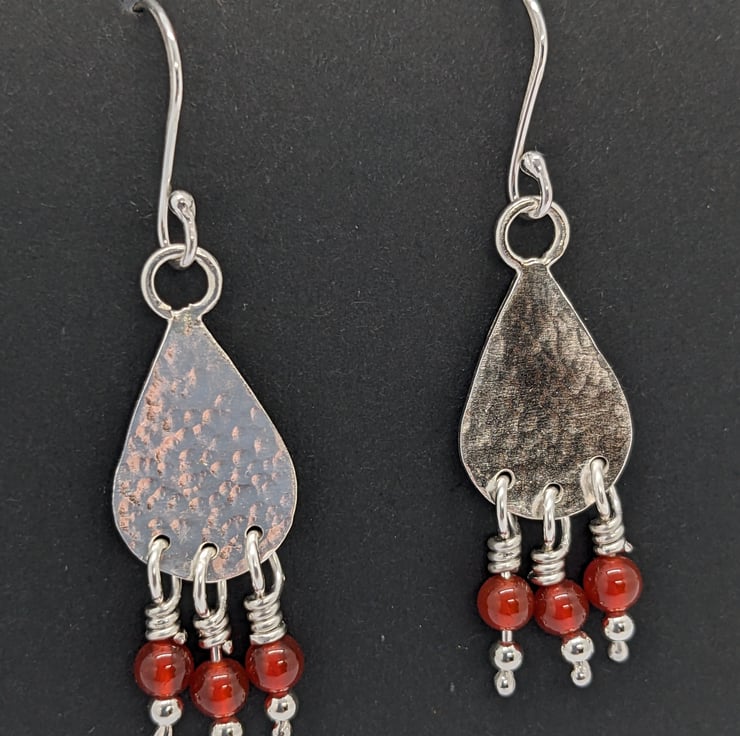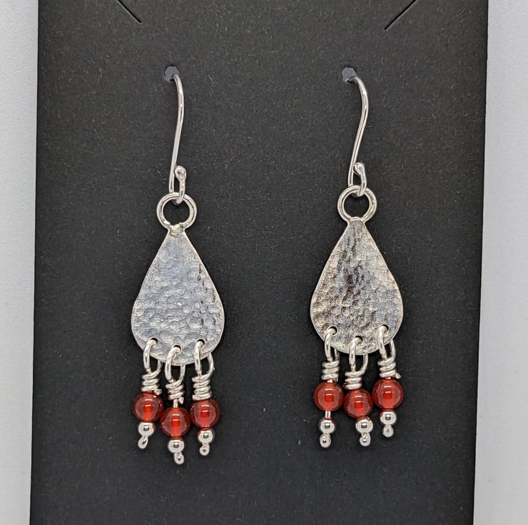Hand saw pierced, teardrop shaped, sterling silver earrings with a hammered texture. Three semi-precious red agate and three silver beads hang from each earring on handmade headpins. The earrings will be presented on a black card in a cellophane bag.