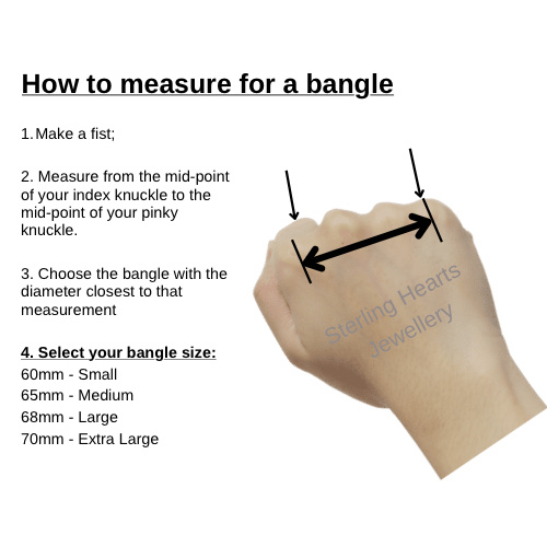 In order to find your correct size, make a fist and with a ruler or tape measure, simply measure across your knuckles from the middle of your first knuckle to the middle of your fourth knuckle, this will give you your bangle diameter.