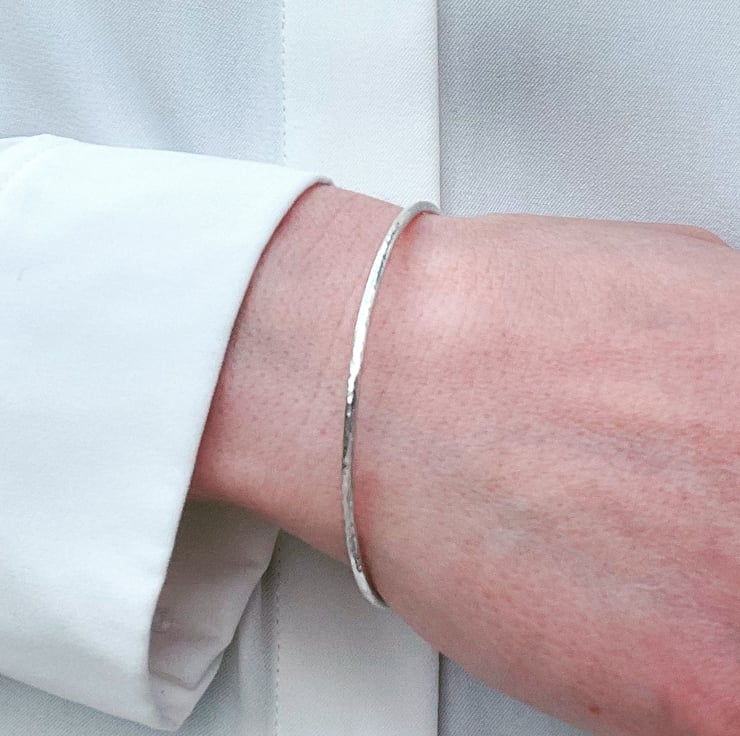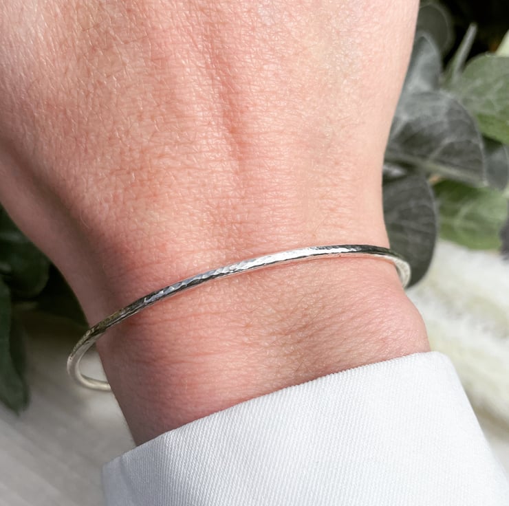 This is a skinny sterling silver hammered bangle made from recycled sterling silver wire. It measures 2mm thick and comes in a variety of sizes. The lovely hammered texture catches the light beautifully.