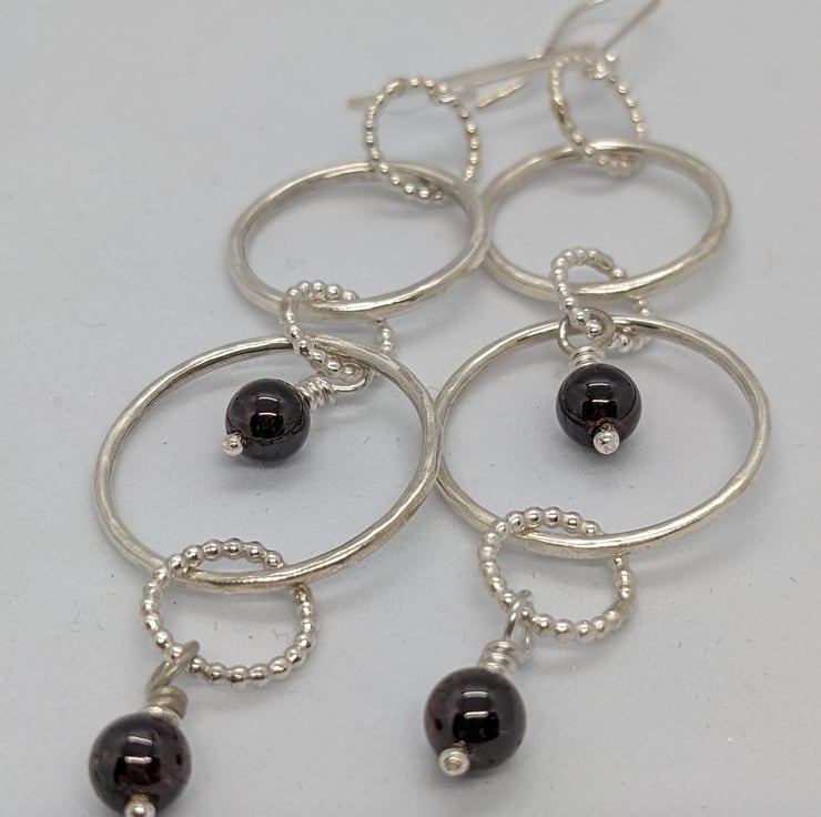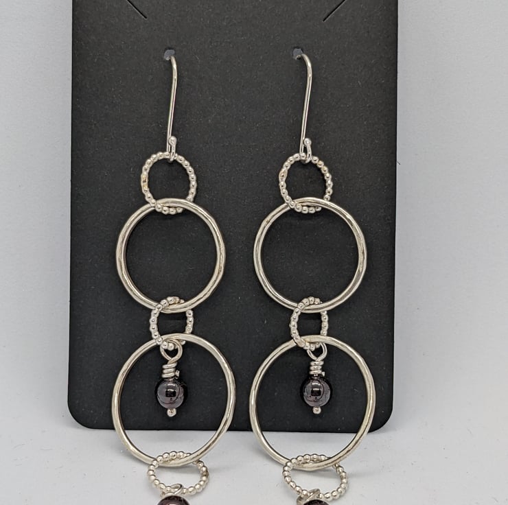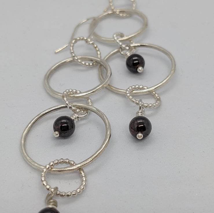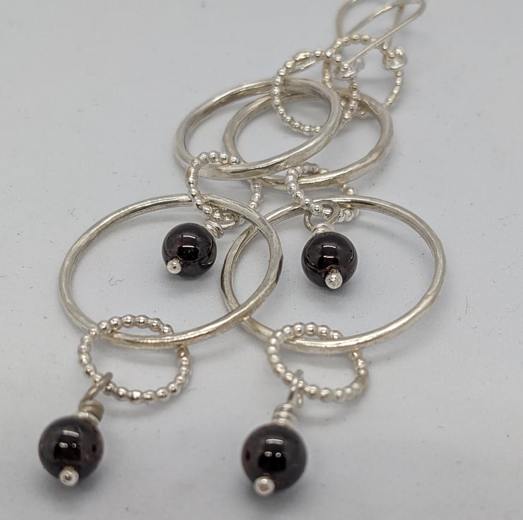 These handmade sterling silver earrings would be perfect for anyone who likes to wear long, statement earrings with lots of movement. They feature sterling silver handmade rings of both hammered round wire and beaded wire- five rings in each earring. Both earrings have semi-precious black-red garnet beads hanging from handmade headpins. They will be presented in a black cardboard box.