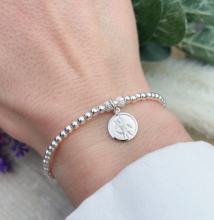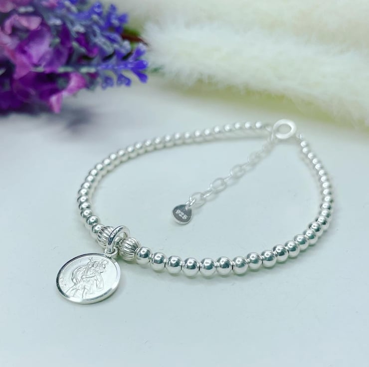This bracelet features a dainty 10mm sterling silver Saint Christopher charm and 3mm sterling silver beads and finished with a sterling silver extender chain and clasp.