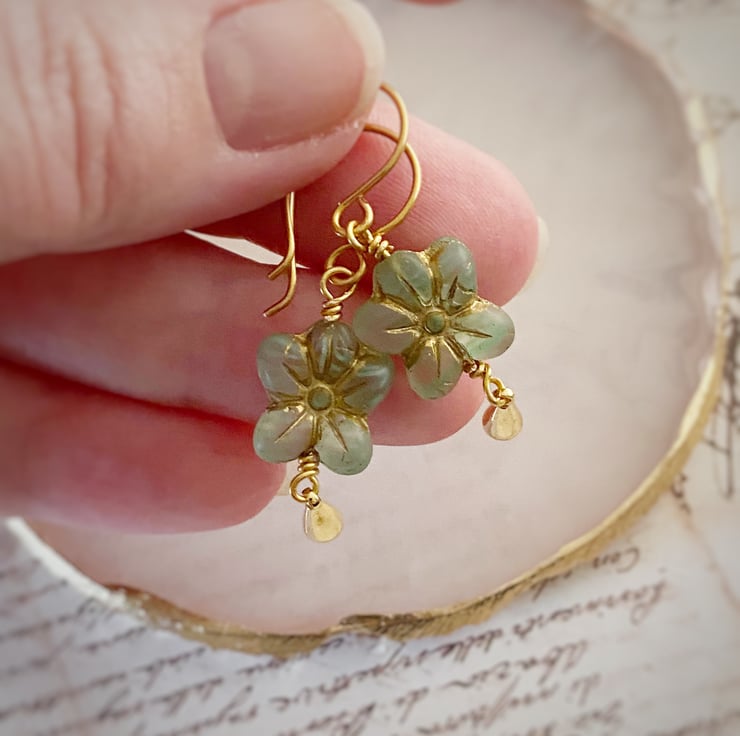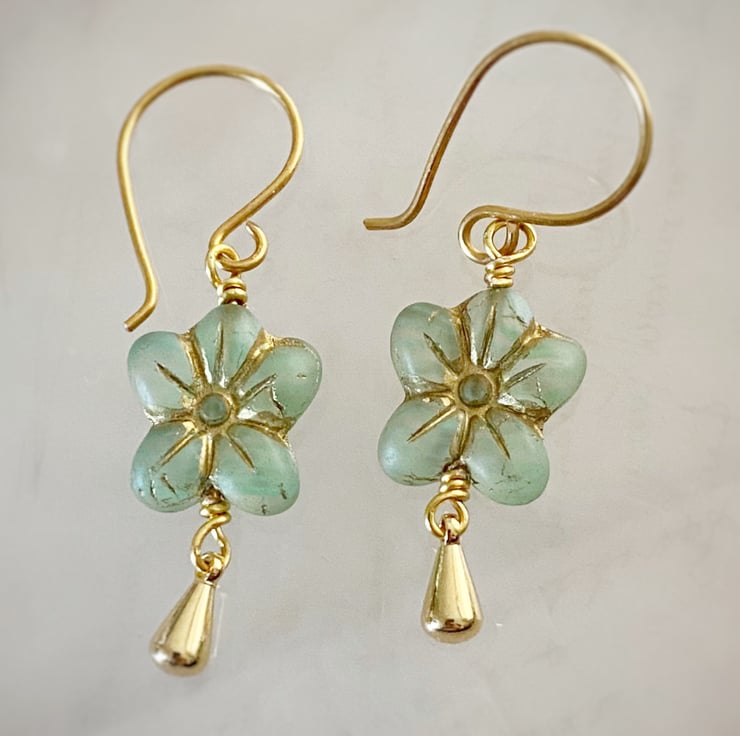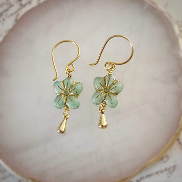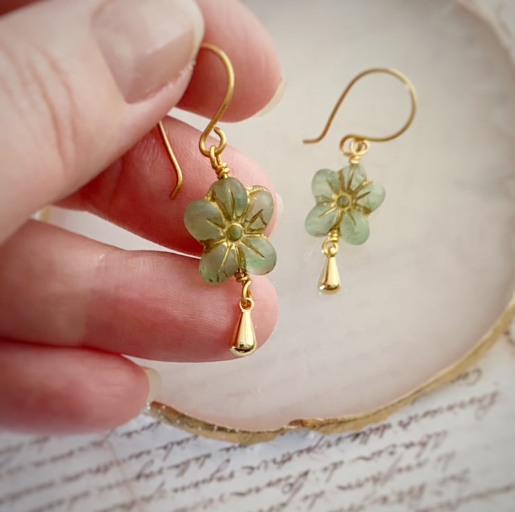 Green glass flower bead earrings with a gold plated teardrop charm which hangs from handmade ear wire hooks.
