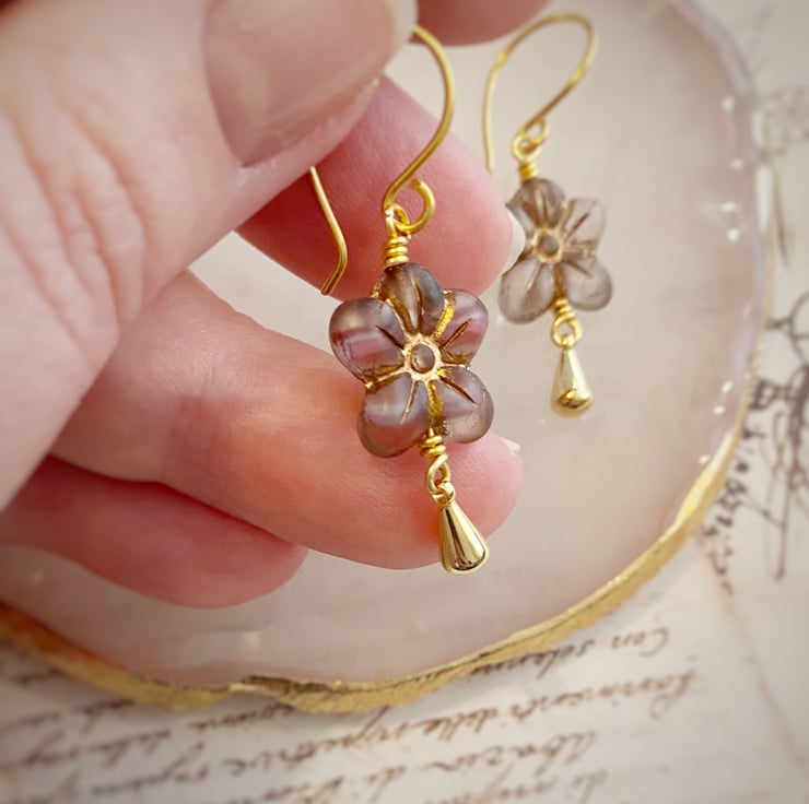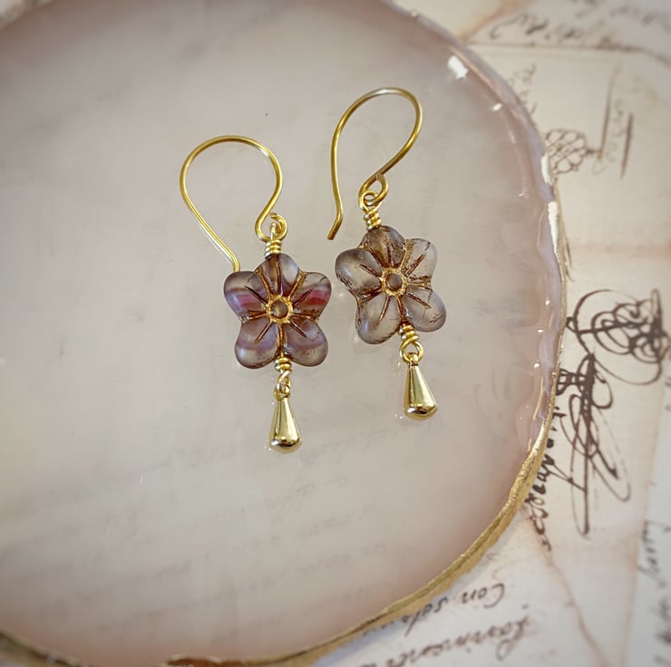 Purple glass flower bead earrings with a gold plated teardrop charm which hangs from handmade ear wire hooks.