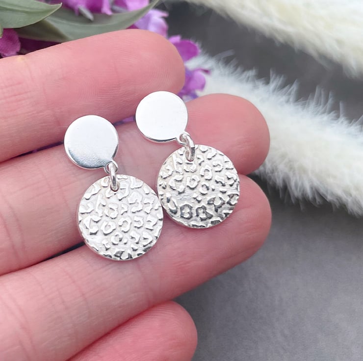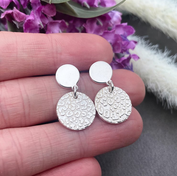 These are handmade sterling silver dangle stud earrings that have been given a lovely leopard / animal print texture.