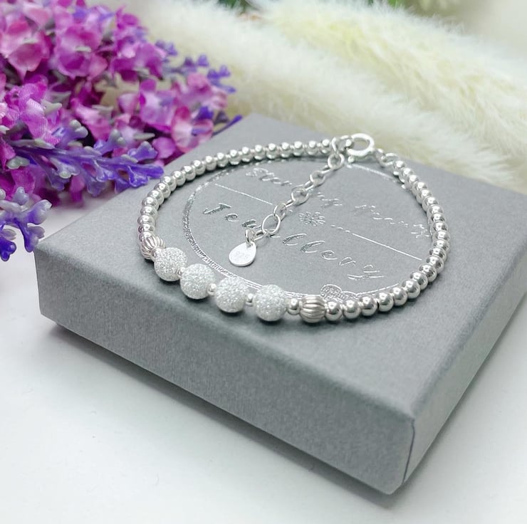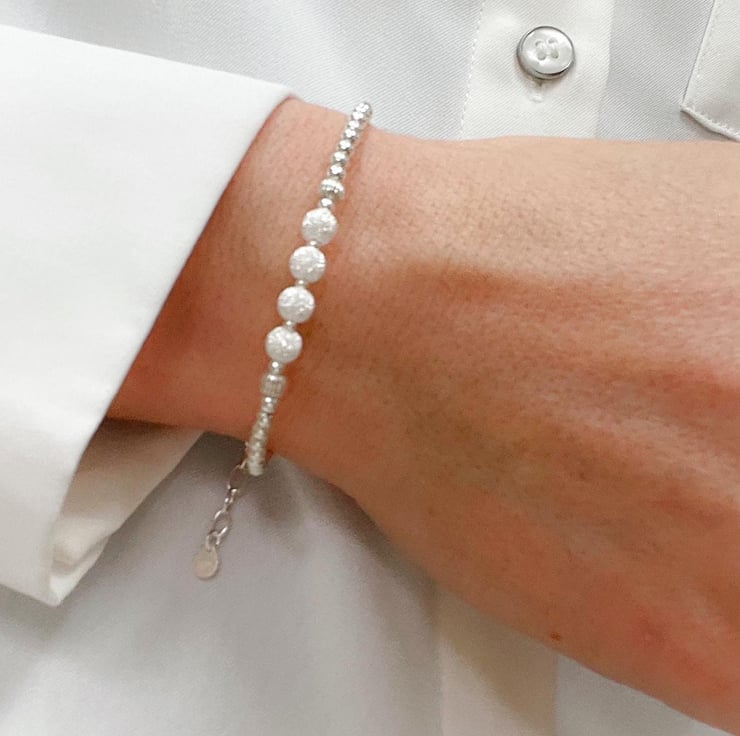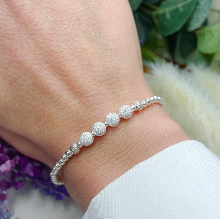 This dainty bracelet is made with 5mm sterling silver sparkly beads, 3mm sterling silver beads, and is finished with an extended chain.