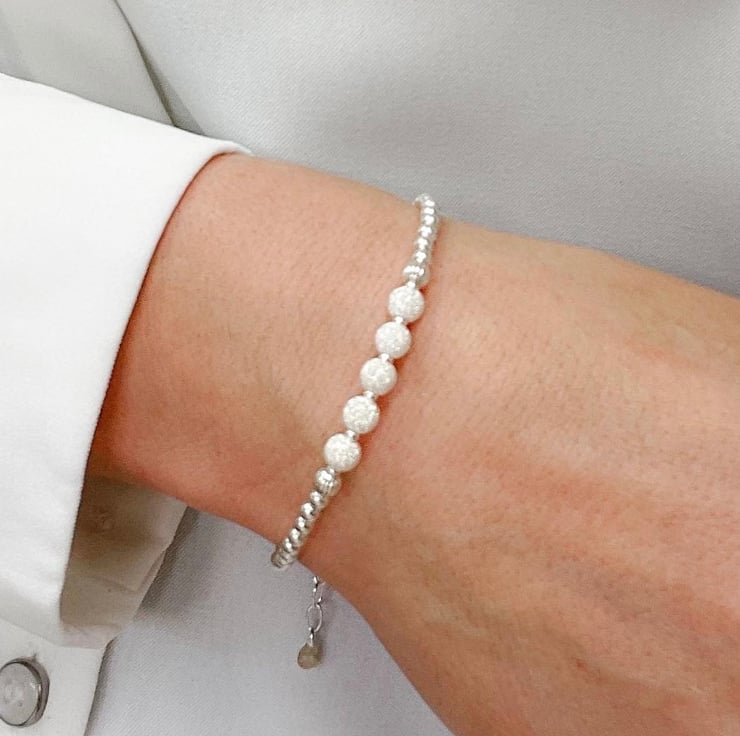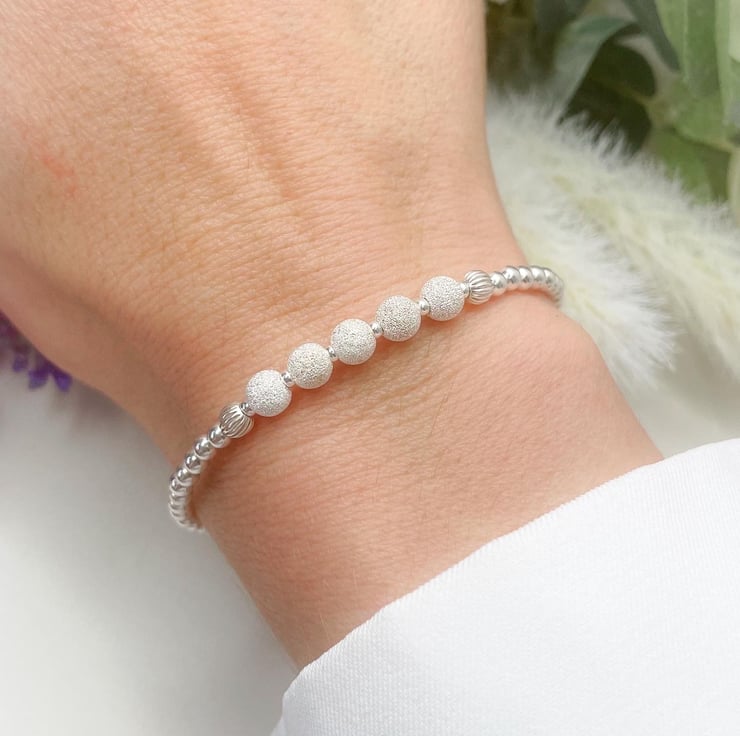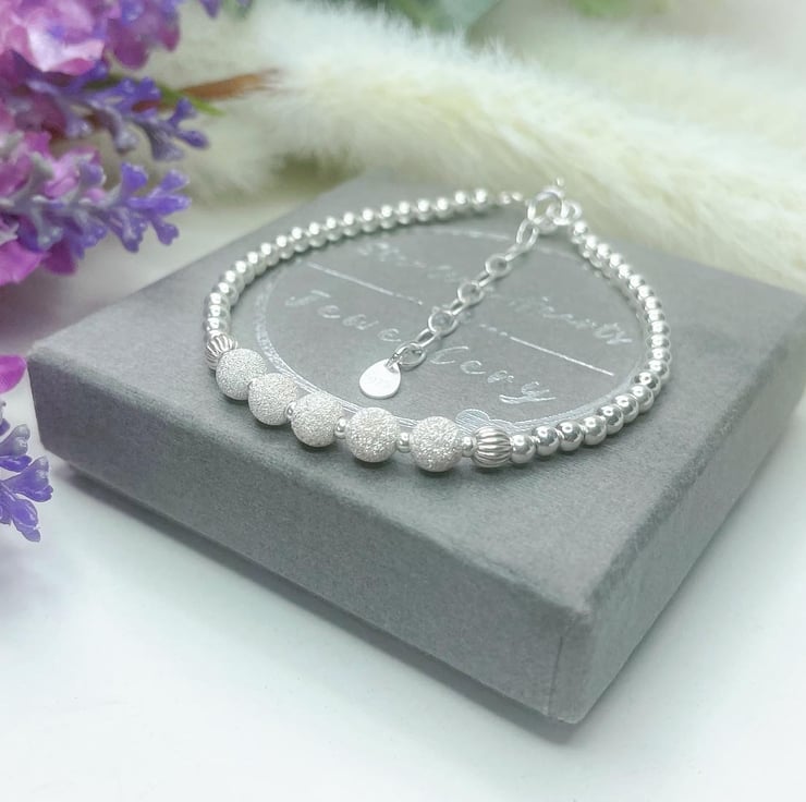 This dainty 50th birthday bracelet is made with 3mm sterling silver beads, and 5mm sparkly sterling silver beads and is finished with an extended chain.